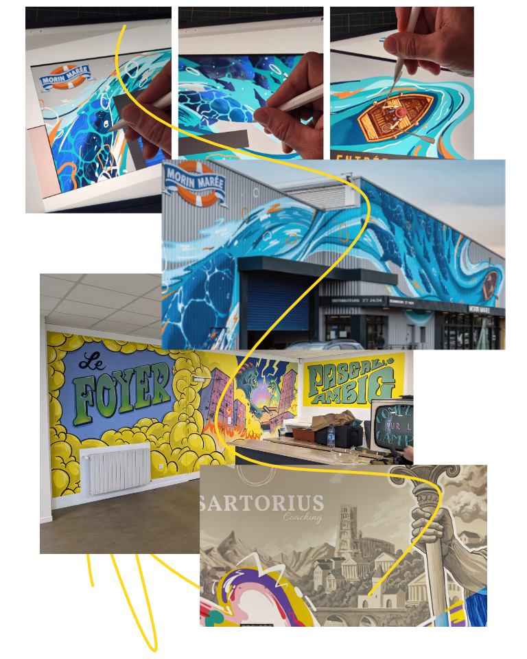 J'ai commencé le graffiti au début des années 2000 juste pour le plaisir de peindre des murs. J'ai toujours continué de peindre en parallèle et en complément de mon métier de graphiste illustrateur me permettant de proposer des œuvres uniques et adaptées aux demandes des clients. Grâce à la collaboration avec Arnaud Maffre (art-mural), graffitti artiste(croké) et artisan peintre hors pair, nous offrons une qualité professionnelle au rendu final et une tenue dans le temps optimale. Nous répondons à des commandes institutionnelles et privées au sein de l’espace public avec un large domaine d’interventions et sur de nombreux supports : fresques décoratives, graffitis, trompe l’œil, fresques participatives…