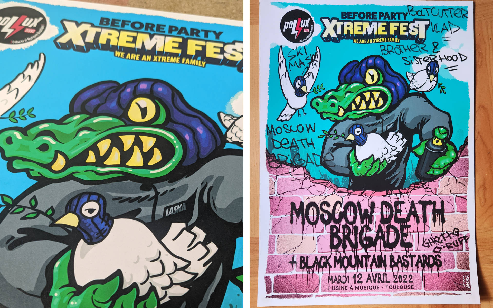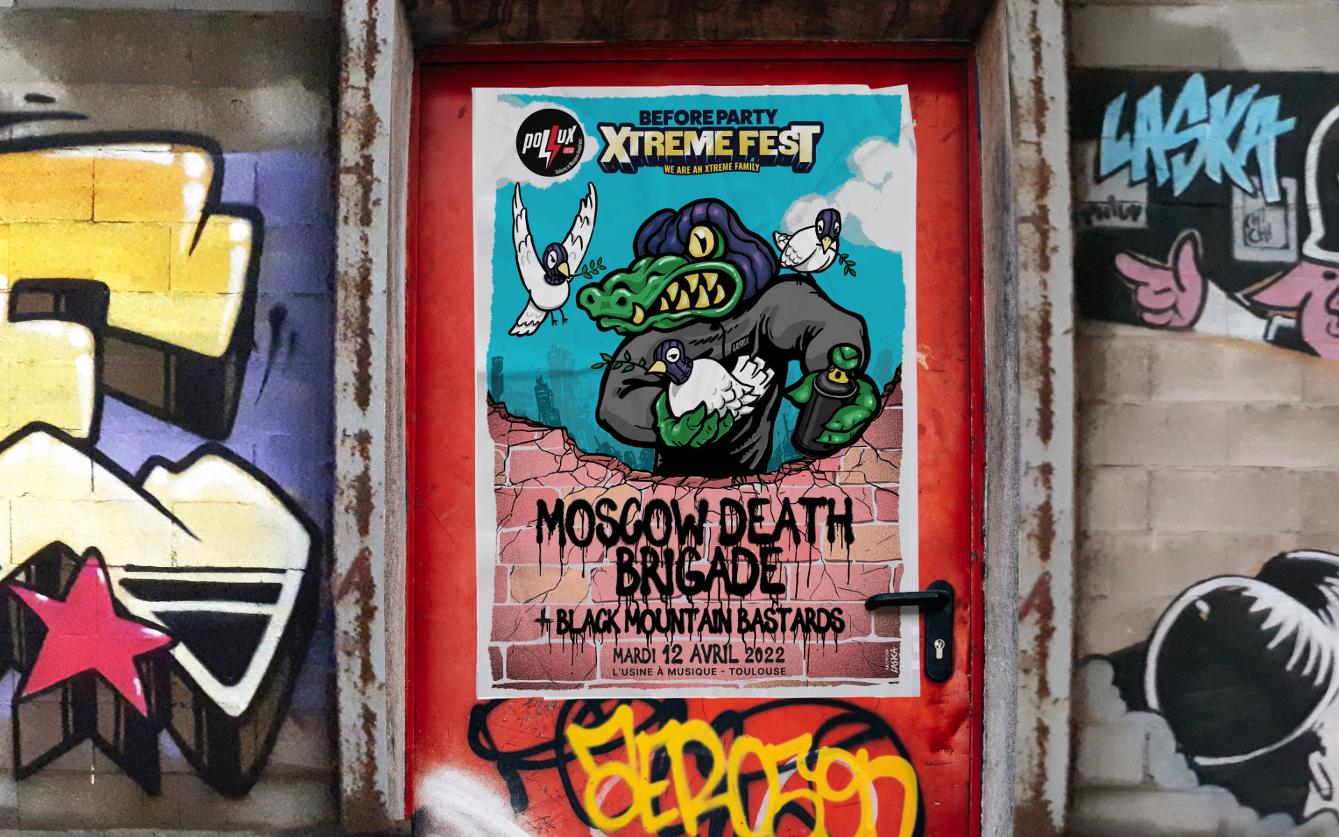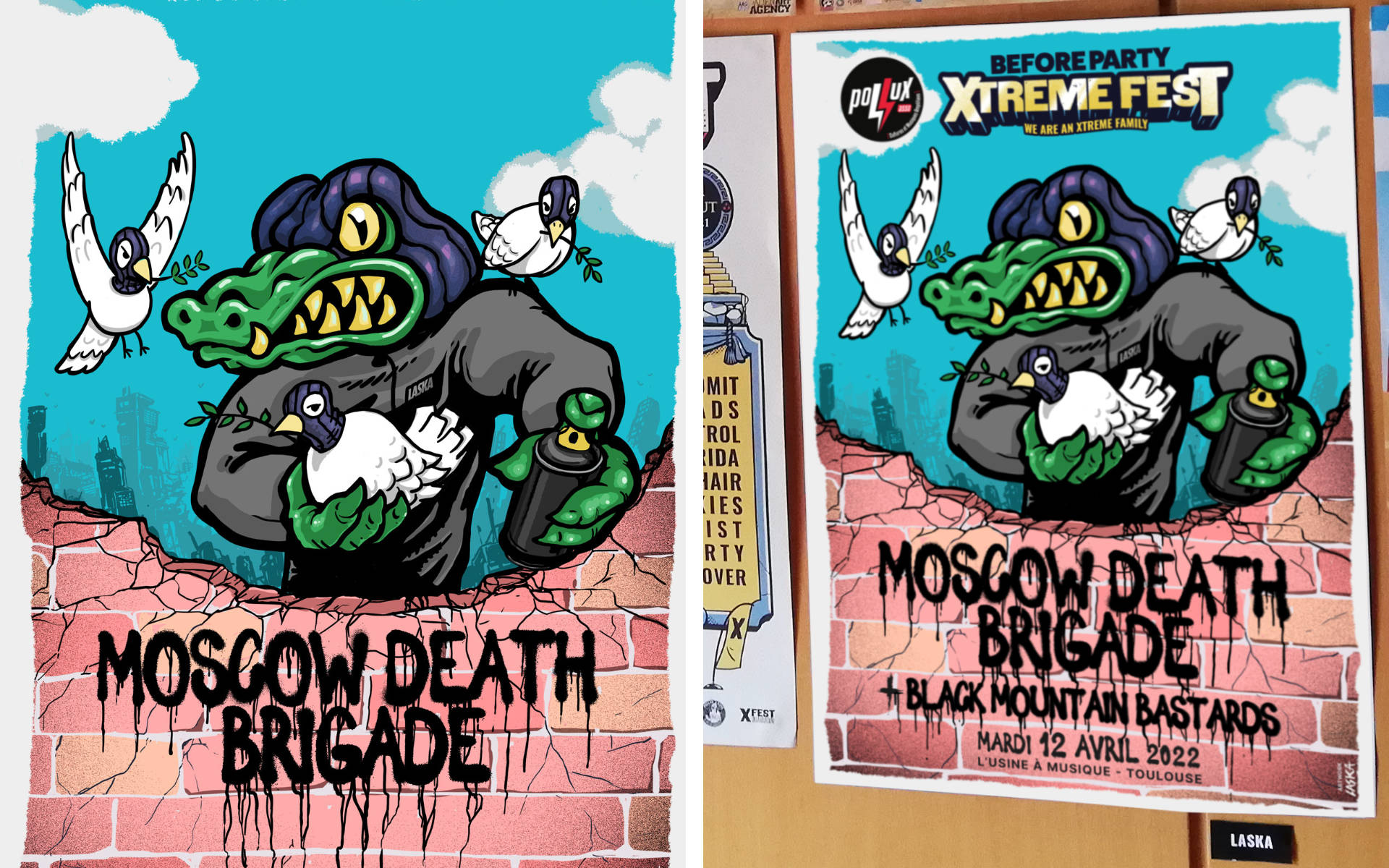 Sachant que le groupe Moscow Death Brigade est investi dans le graffiti, c'est tout naturellement que David de Pollux m'as proposé de concevoir l'affiche pour leur before Party de l'Xtreme fest. J'ai donc soumis plusieurs concepts, et c'est celui ou le Croco, l'âme du groupe, est entouré de 3 colombes de la paix, symbolisant les 3 mc's du groupe qui sont porteur d'un message de paix et d'espoir.