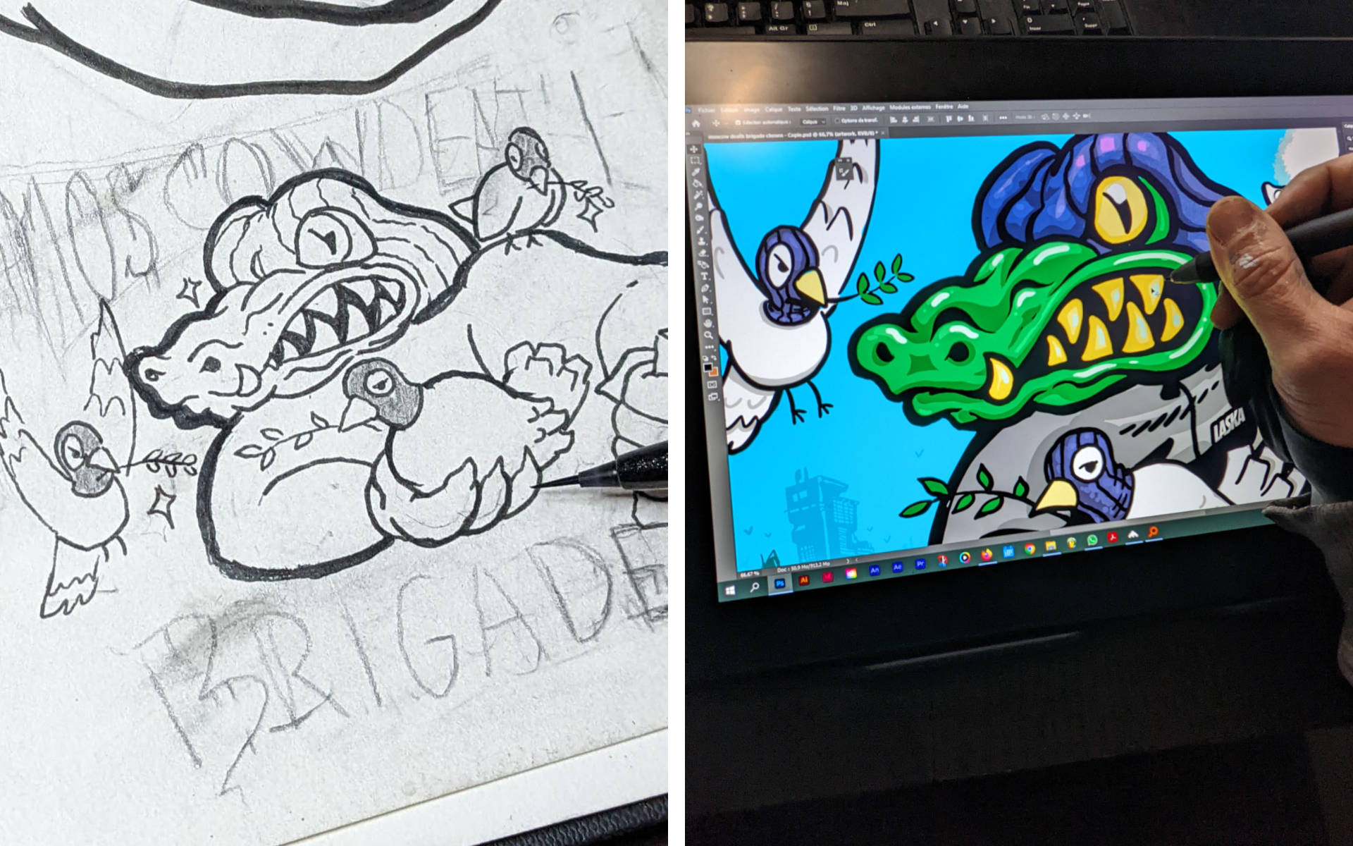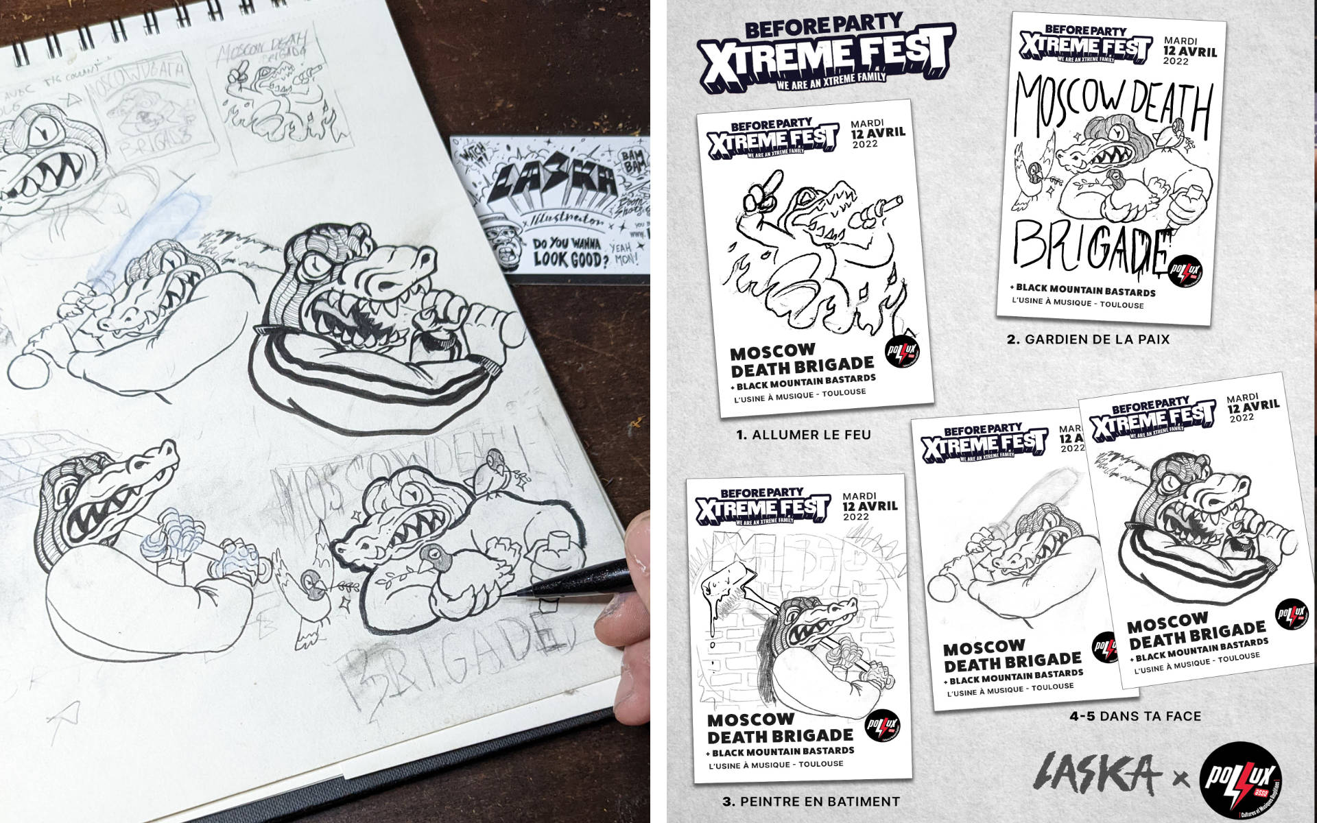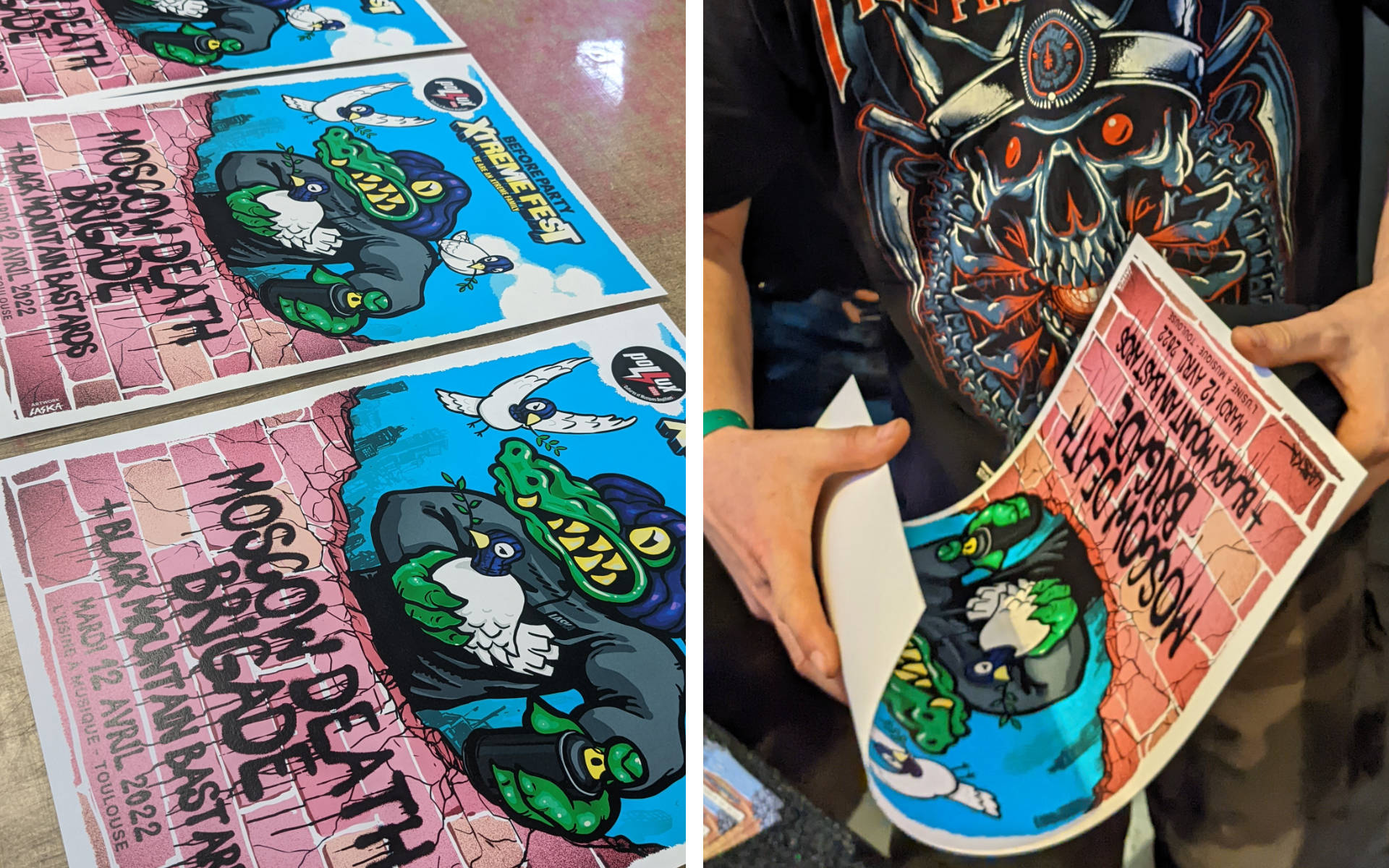Sachant que le groupe Moscow Death Brigade est investi dans le graffiti, c'est tout naturellement que David de Pollux m'as proposé de concevoir l'affiche pour leur before Party de l'Xtreme fest. J'ai donc soumis plusieurs concepts, et c'est celui ou le Croco, l'âme du groupe, est entouré de 3 colombes de la paix, symbolisant les 3 mc's du groupe qui sont porteur d'un message de paix et d'espoir.