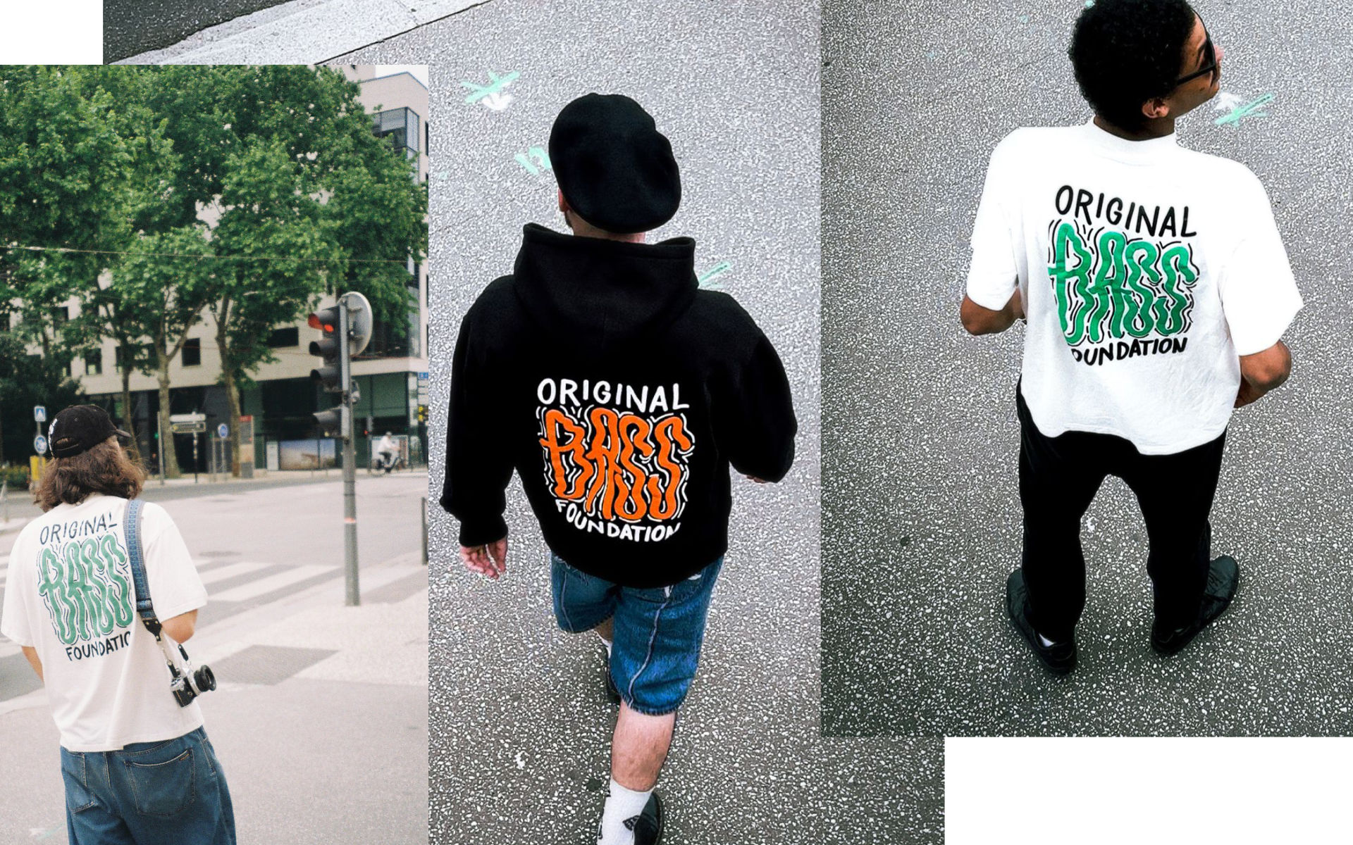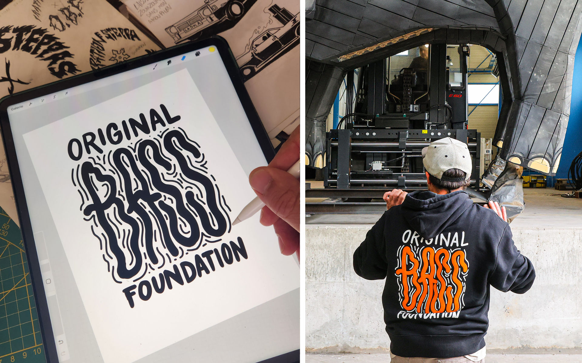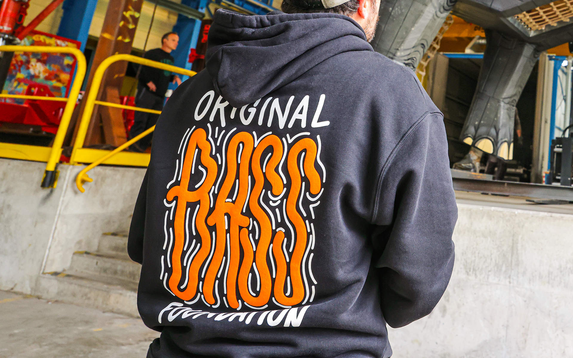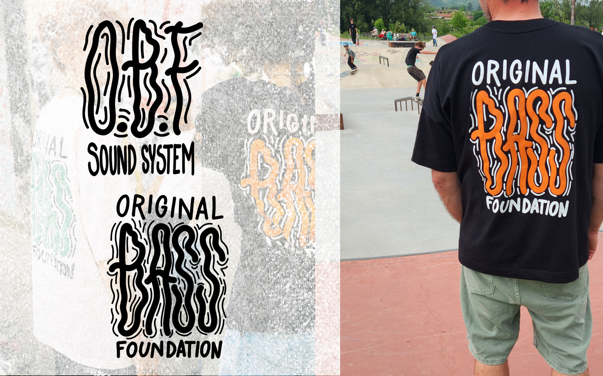 Après de nombreuses années à travailler pour O.B.F, sound-system mythique de la scène sound-system française et même mondiale, j’ai eu l’honneur de réaliser leur t-shirt signature ! En effet, ils n’avaient jamais sorti de t-shirt avec leur nom complet : Original Bass Foundation. J’ai donc conçu cette typographie vibrante, subliment magnifiée par Zach du label Dubquake qui a designé les couleurs de cette série de t-shirt et hoodies emblématique !