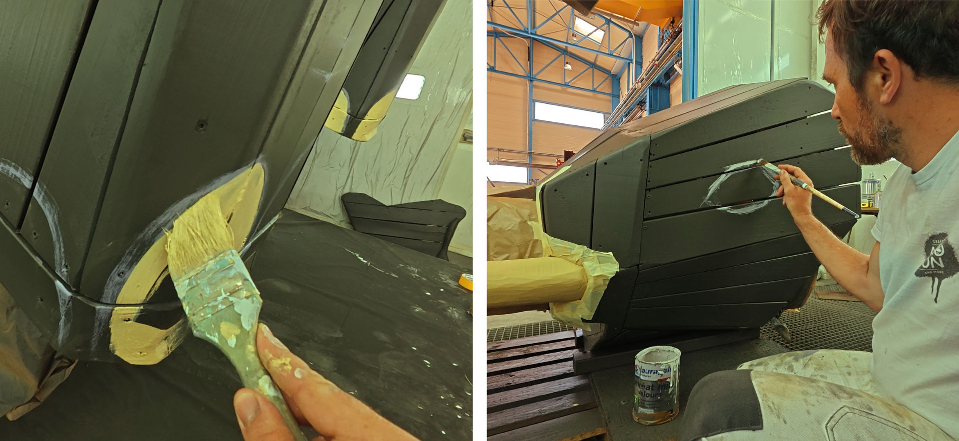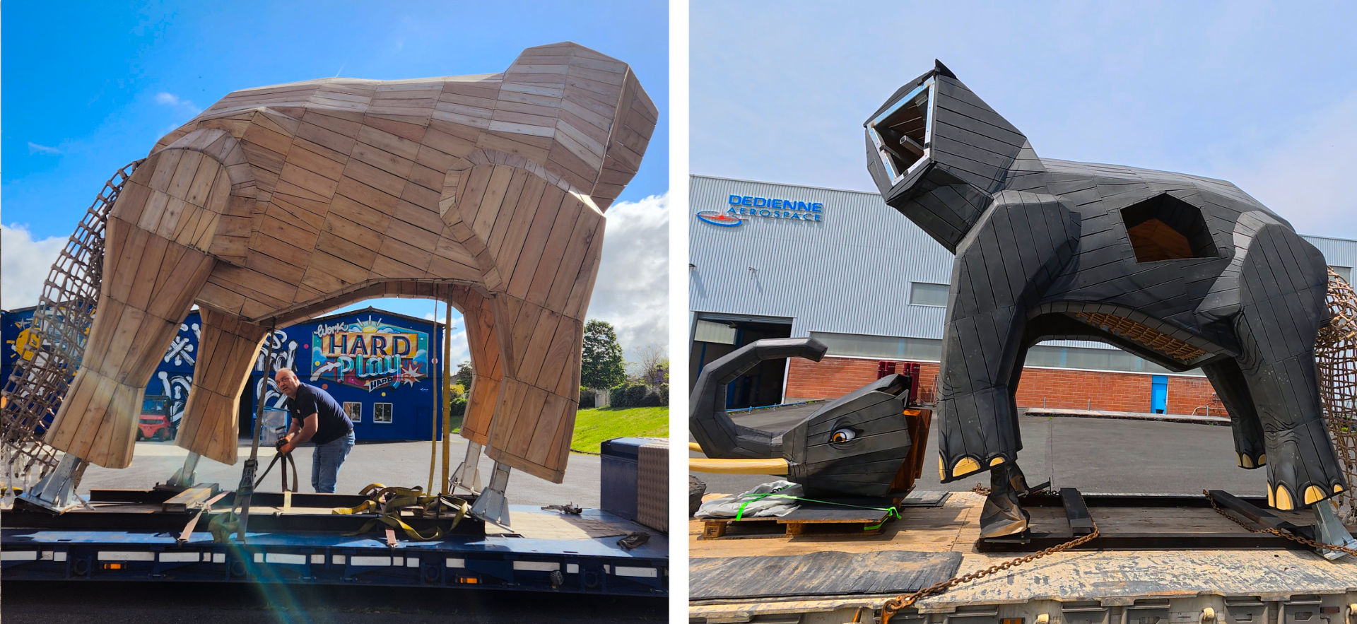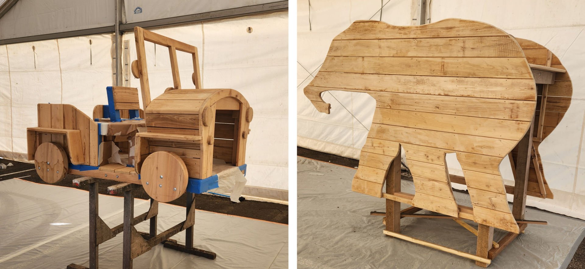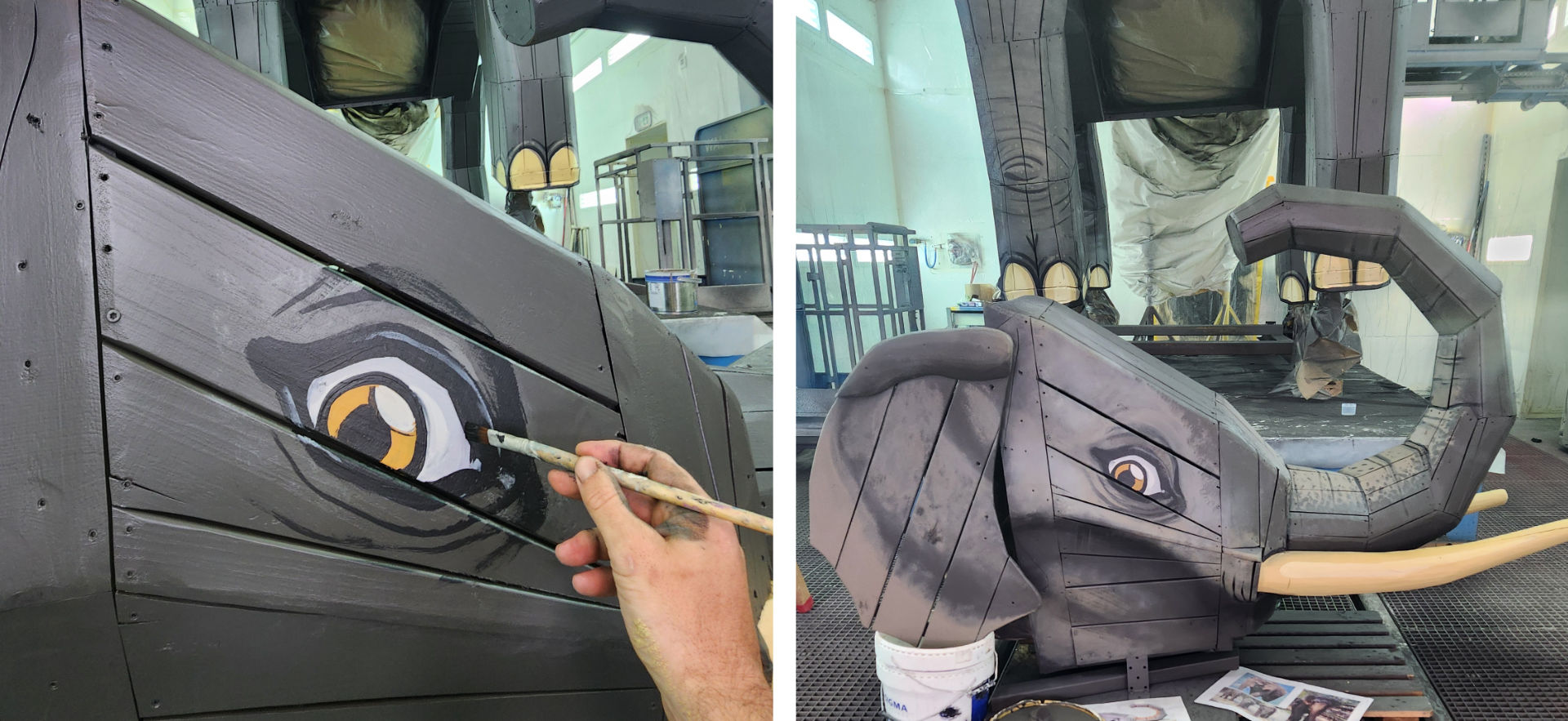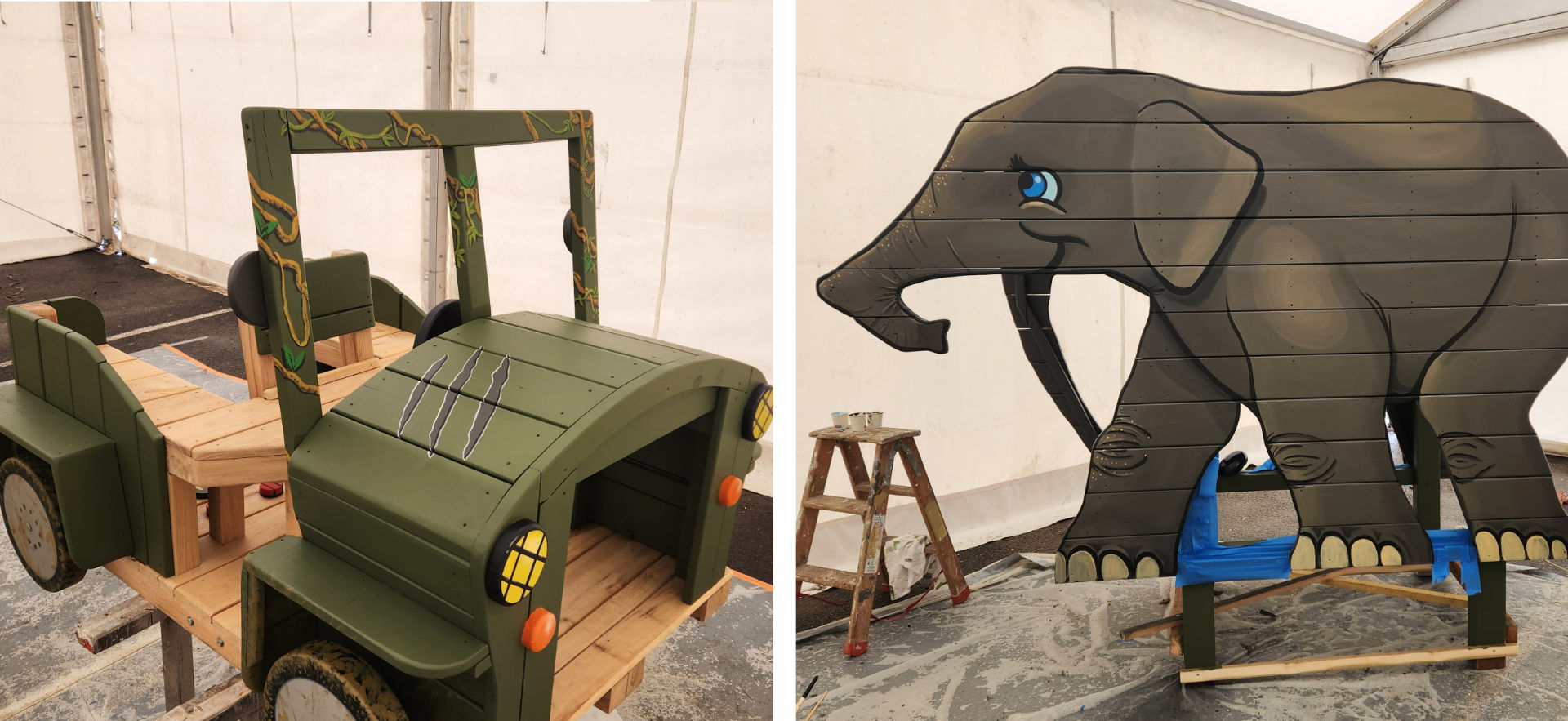 Dans un premier temps, nous sommes montés sur Epinal pour commencer à peindre les petits modules qui n'en étaient pas moins technique à réaliser. Nous avons donné vie à la jeep, avec ses traces de boues sur les roues, une griffe de tigre sur le capot, une liane accrochée au pare brise. Nous avons également donné vie au bébé éléphant qui termine le cortège.