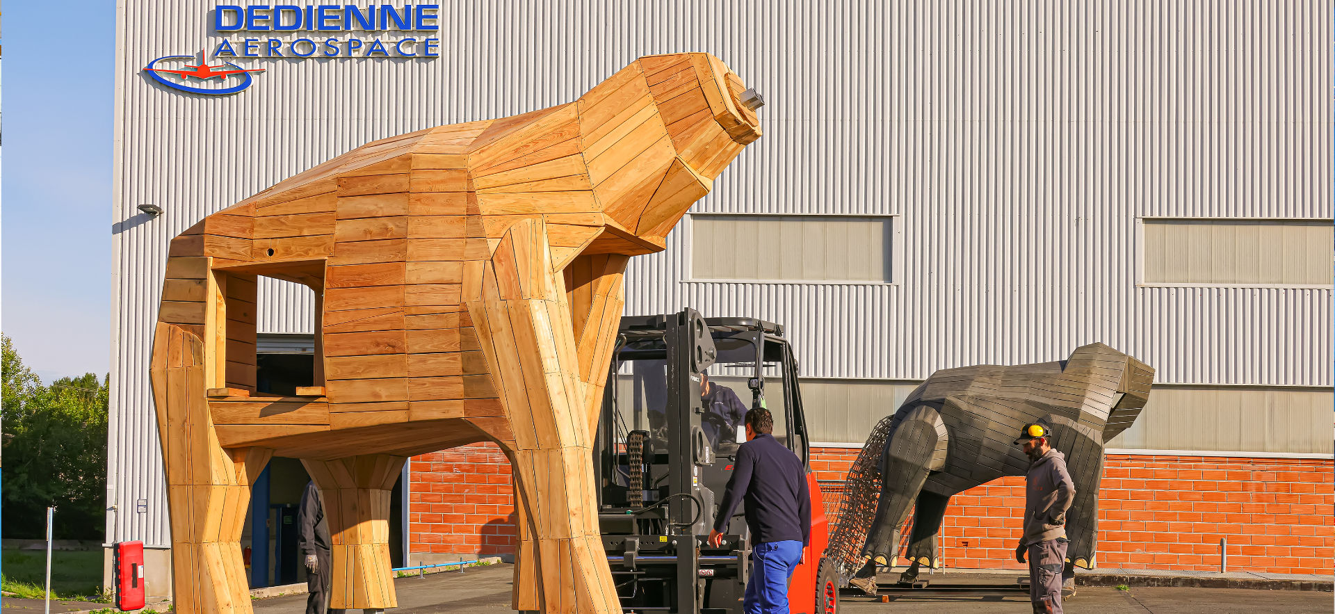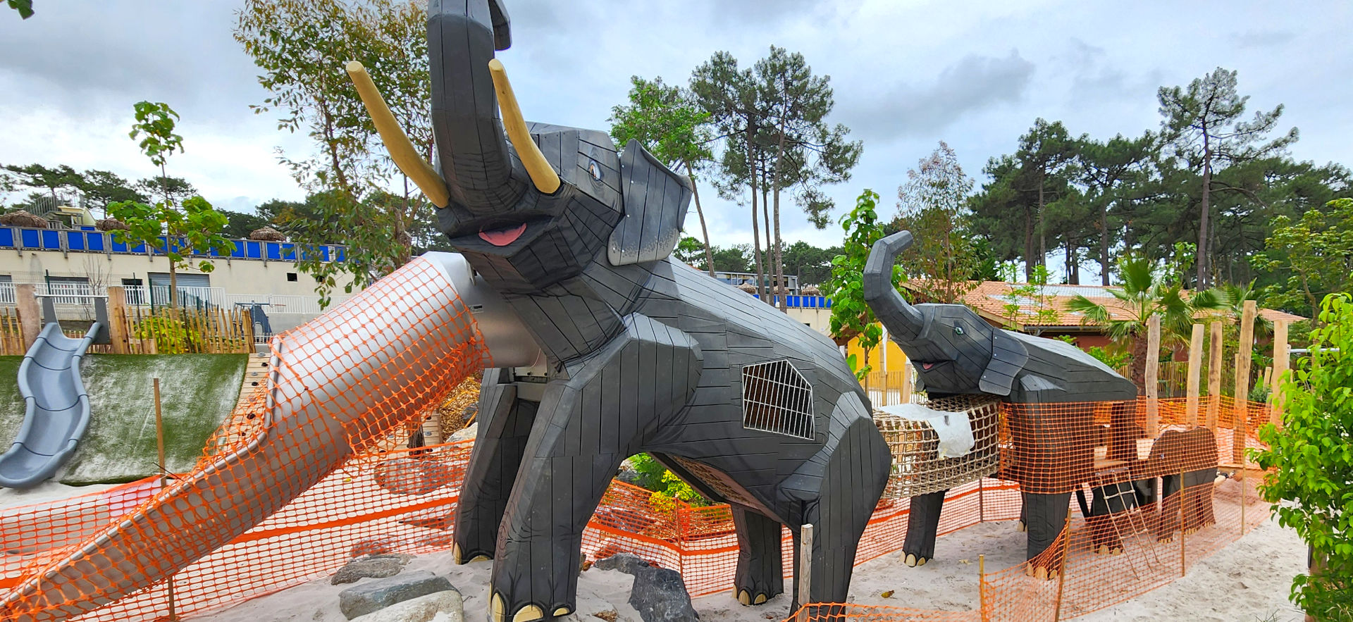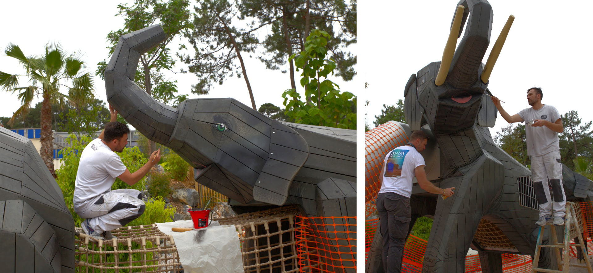 Nous avons eu la chance de participer à un projet unique : donner vie à 3 éléphants en bois, de 2 à 5 mètres de haut, pour une aire de jeux au camping Airotel L’Océan à Lacanau. L’idée vient de Vincent, le directeur du camping, qui voulait créer un univers inspiré de l’Asie, en hommage à ses origines. Les structures ont été conçues par Pro Urba dans leur atelier d'Epinal, puis transportées jusqu’à Saint-Juéry pour être peintes dans une cabine de 100 m², mise à disposition par Dedienne Aerospace pour finalement être transportées jusqu'au camping de l'Océan à Lacanau. Pendant 1 mois et demi, nous avons travaillé à deux pour créer des textures, des ombres, du volume pour que ces éléphants aient du caractère et nous racontent une histoire.