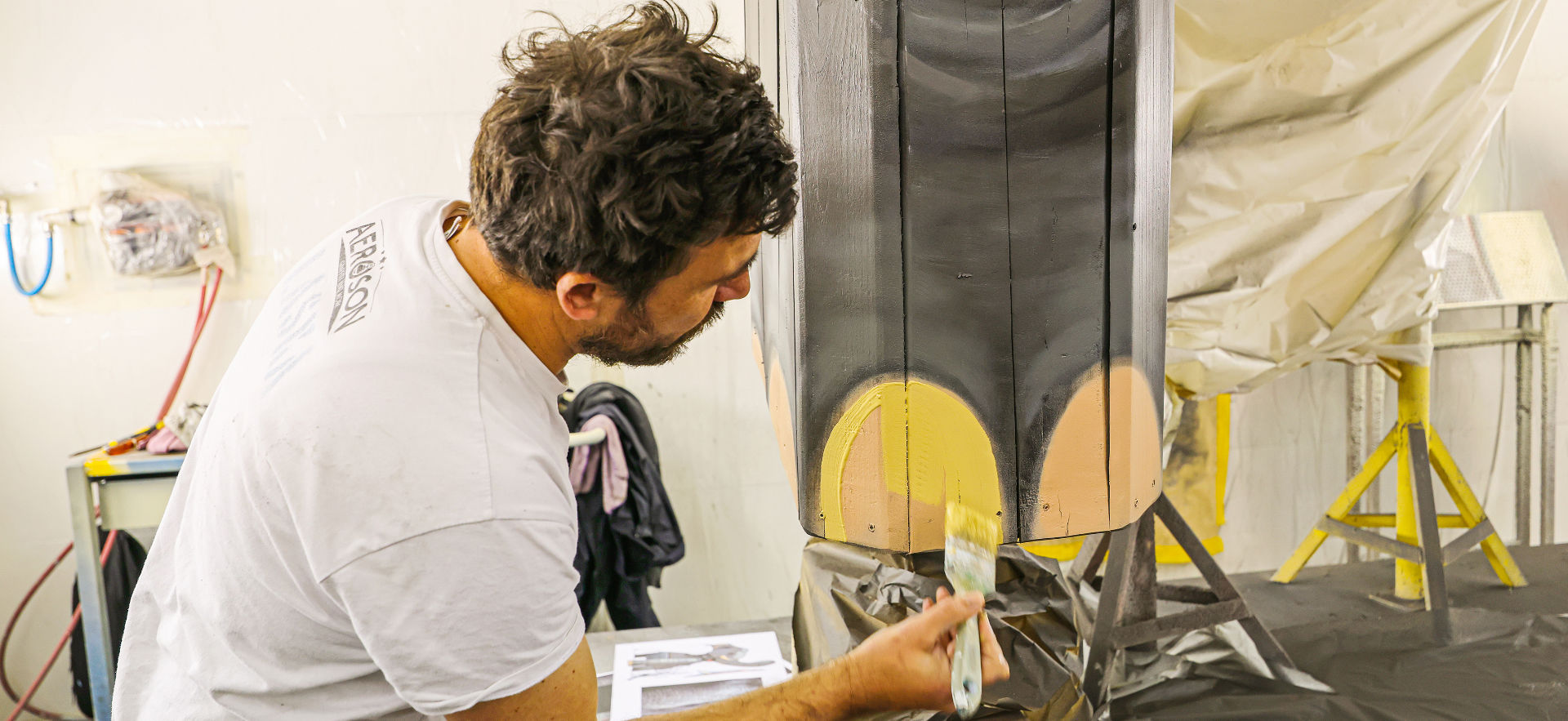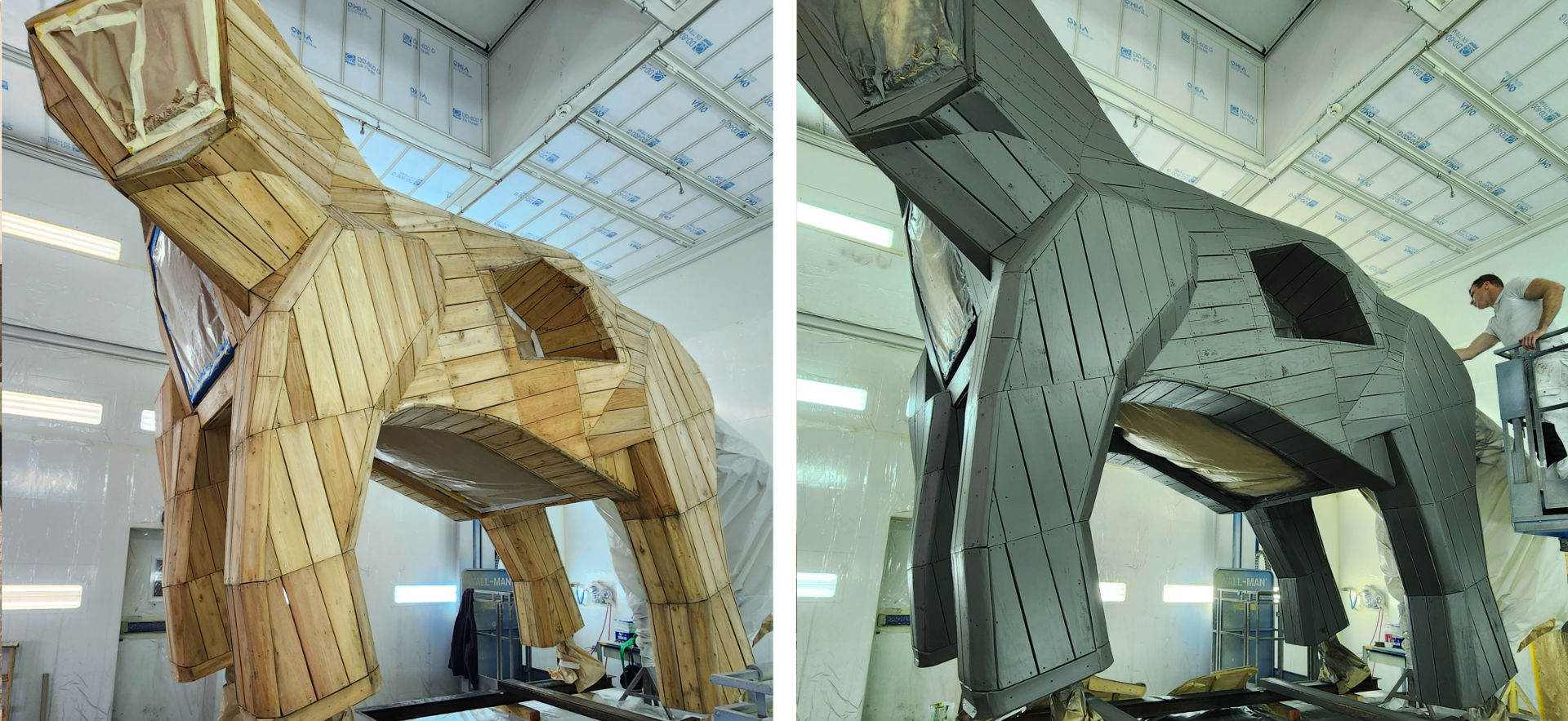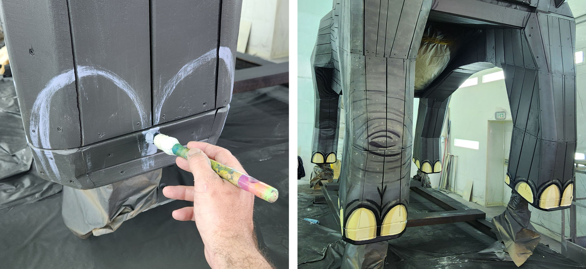 Nous avons eu la chance de participer à un projet unique : donner vie à 3 éléphants en bois, de 2 à 5 mètres de haut, pour une aire de jeux au camping Airotel L’Océan à Lacanau. L’idée vient de Vincent, le directeur du camping, qui voulait créer un univers inspiré de l’Asie, en hommage à ses origines. Les structures ont été conçues par Pro Urba dans leur atelier d'Epinal, puis transportées jusqu’à Saint-Juéry pour être peintes dans une cabine de 100 m², mise à disposition par Dedienne Aerospace pour finalement être transportées jusqu'au camping de l'Océan à Lacanau. Pendant 1 mois et demi, nous avons travaillé à deux pour créer des textures, des ombres, du volume pour que ces éléphants aient du caractère et nous racontent une histoire.