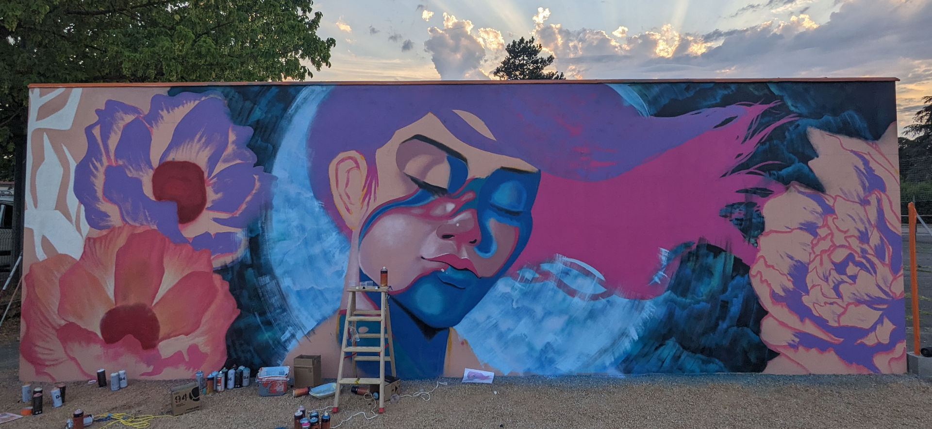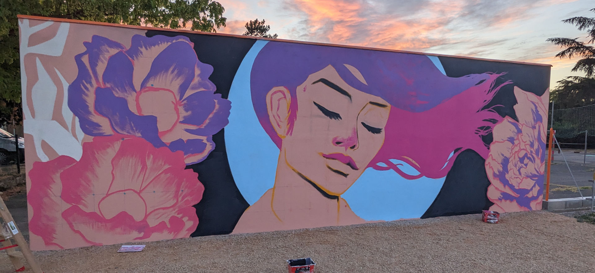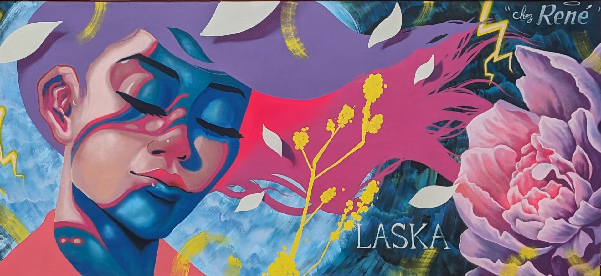 Ville ou mon père à été commerçant pendant plus de 30 ans, j'ai pu lui rendre hommage tout en ayant une totale liberté de création. Je suis parti sur une muse en pleine inspiration dans une pose évanescente entourée de fleurs majestueuses, un souffle poétique aux couleurs assumées. J’ai pu tester de nouveaux effets en peinture avec, comme d’habitude, l’aide précieuse d’Arnaud Maffre pour sa réalisation.