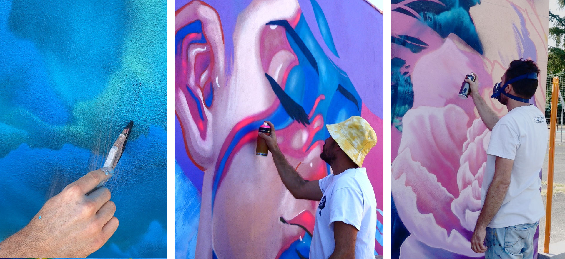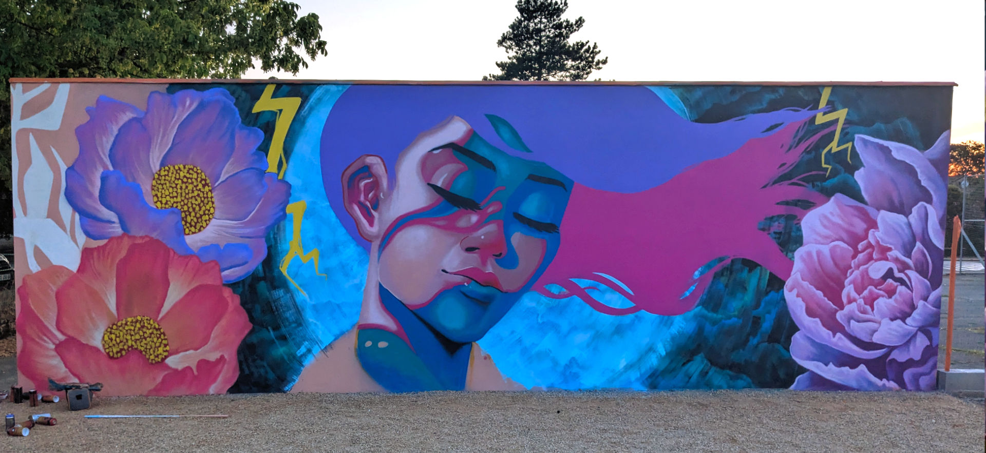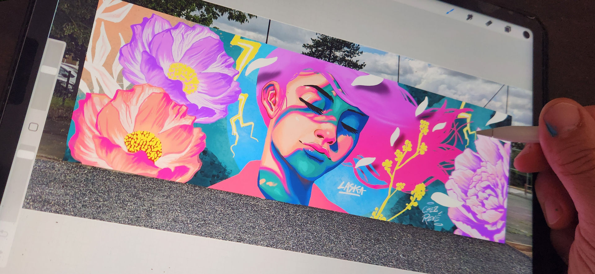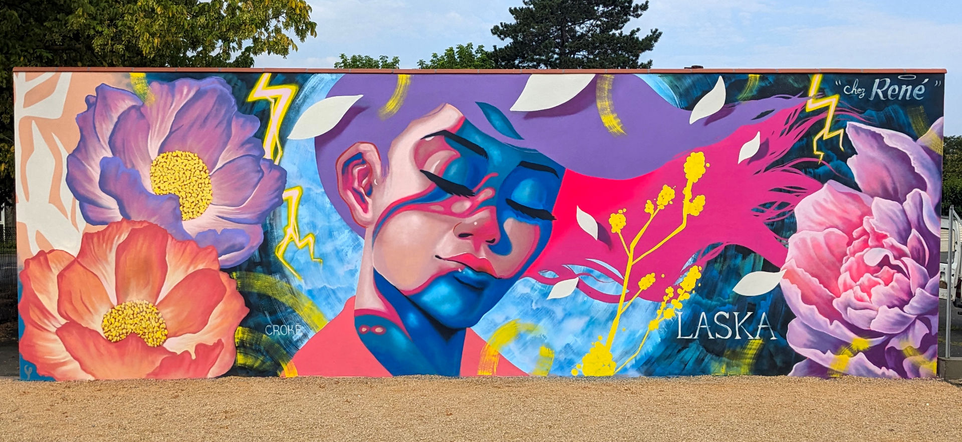 Ville ou mon père à été commerçant pendant plus de 30 ans, j'ai pu lui rendre hommage tout en ayant une totale liberté de création. Je suis parti sur une muse en pleine inspiration dans une pose évanescente entourée de fleurs majestueuses, un souffle poétique aux couleurs assumées. J’ai pu tester de nouveaux effets en peinture avec, comme d’habitude, l’aide précieuse d’Arnaud Maffre pour sa réalisation.