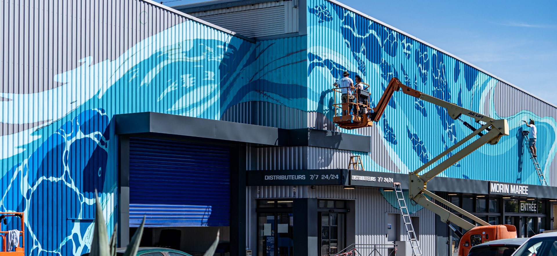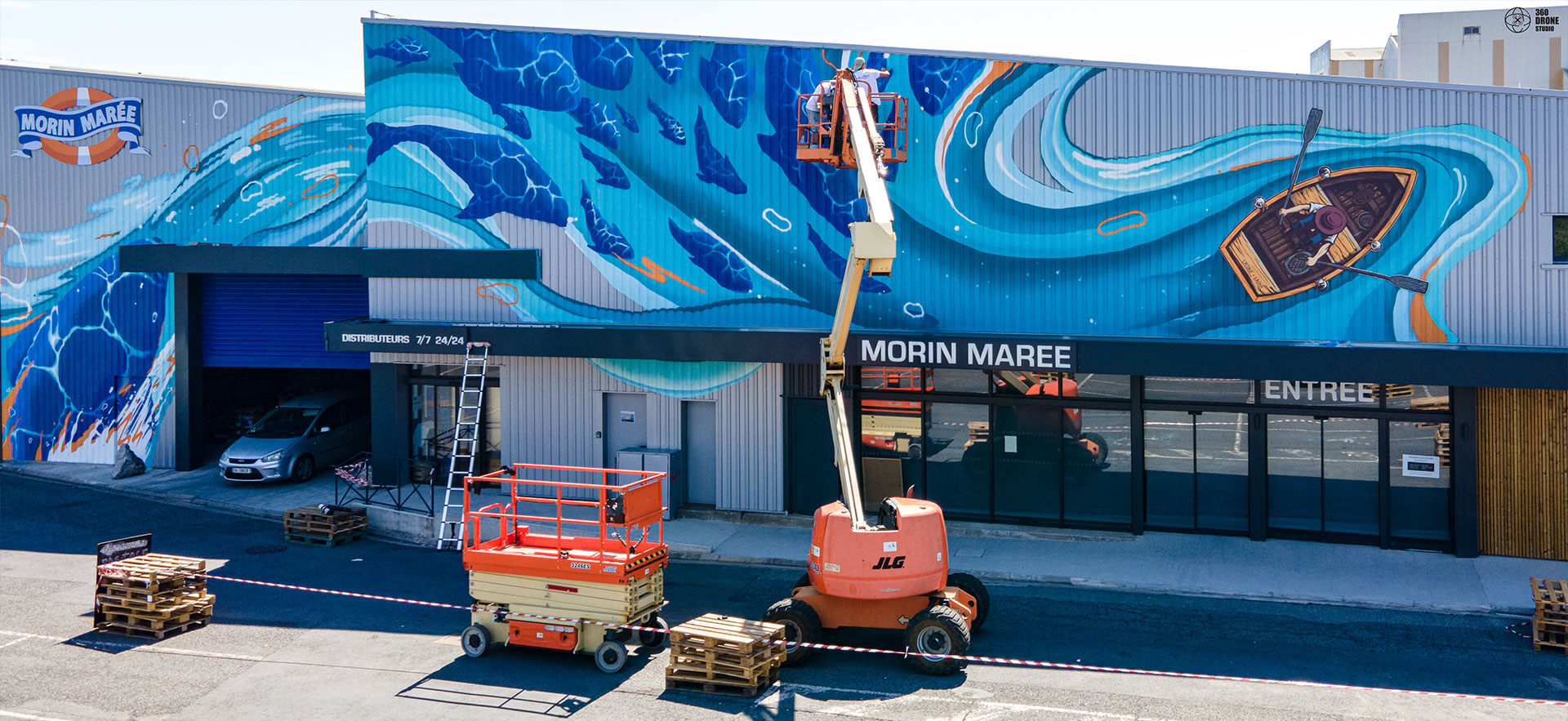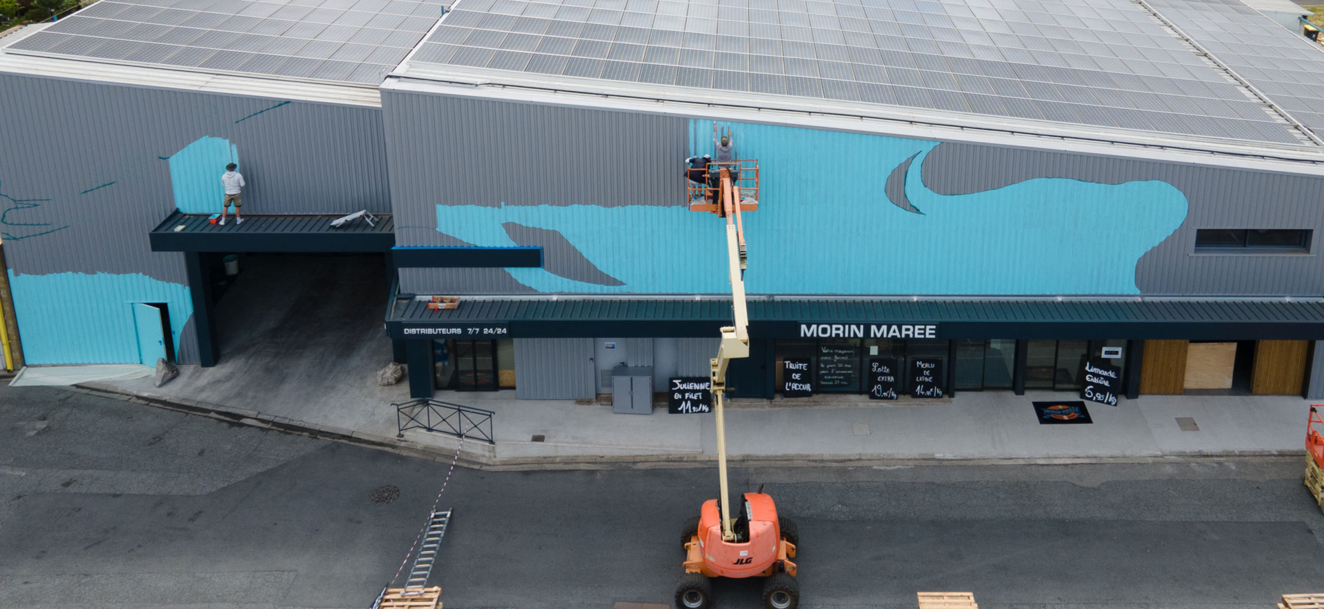 La poissonnerie familiale albigeoise « Morin Marée » nous a contacté pour réaliser un projet artistique sur leur façade, situé à Albi. Nous avions carte blanche pour le visuel, à condition bien évidemment de rester dans l'esprit de l'enseigne et de refléter le coeur du métier de l'entreprise : leur dynamisme, la fraîcheur de leurs produits et leurs valeurs de respect de l'environnement.