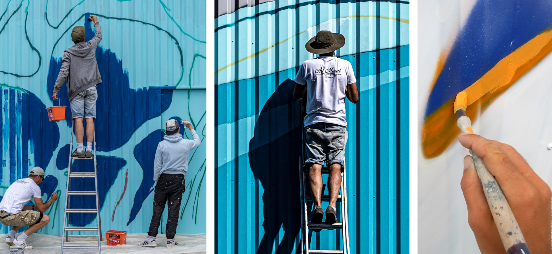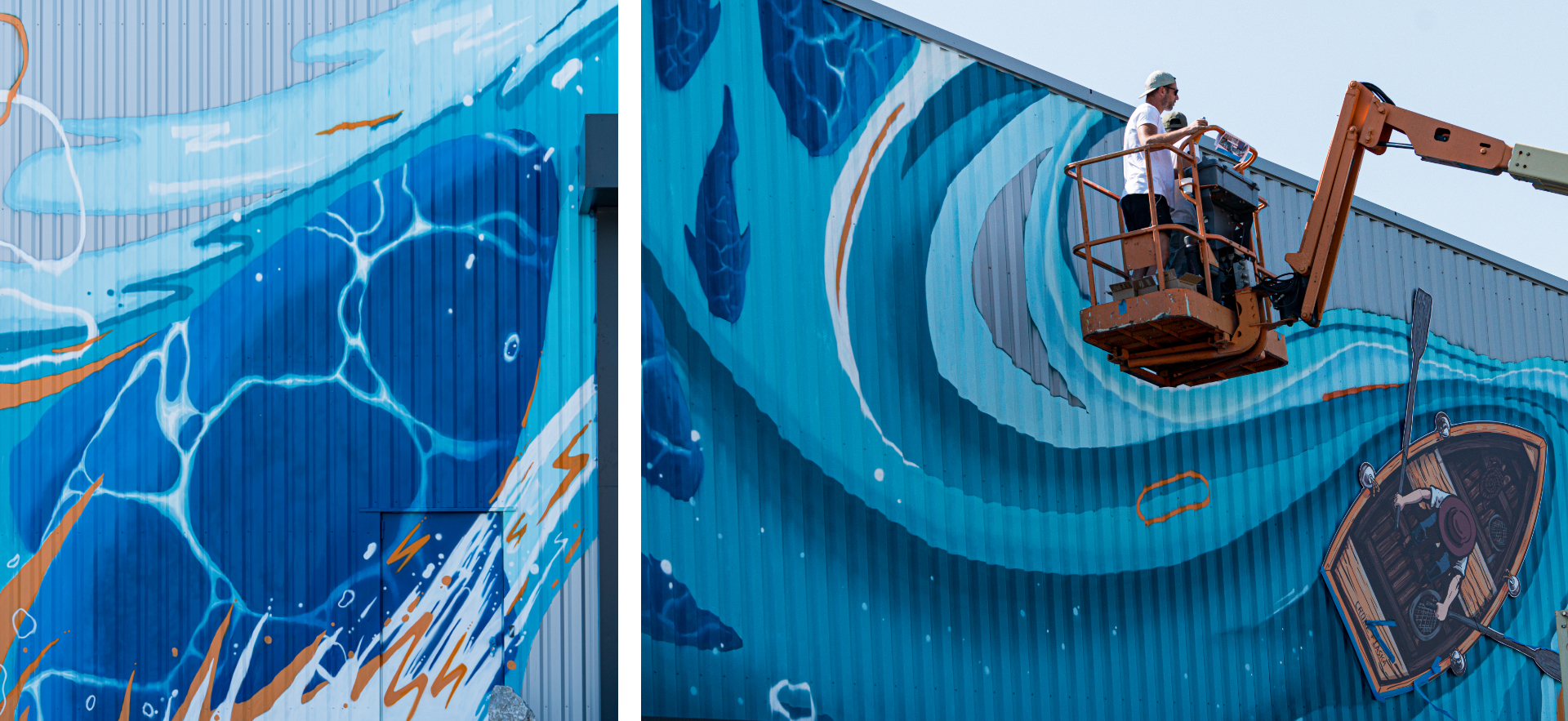 Nous avons commencé à utiliser les bombes de peintures pour les détails et les dégradés dans les poissons, ainsi que les écumes blanches et les dégradés au sein de la vague.