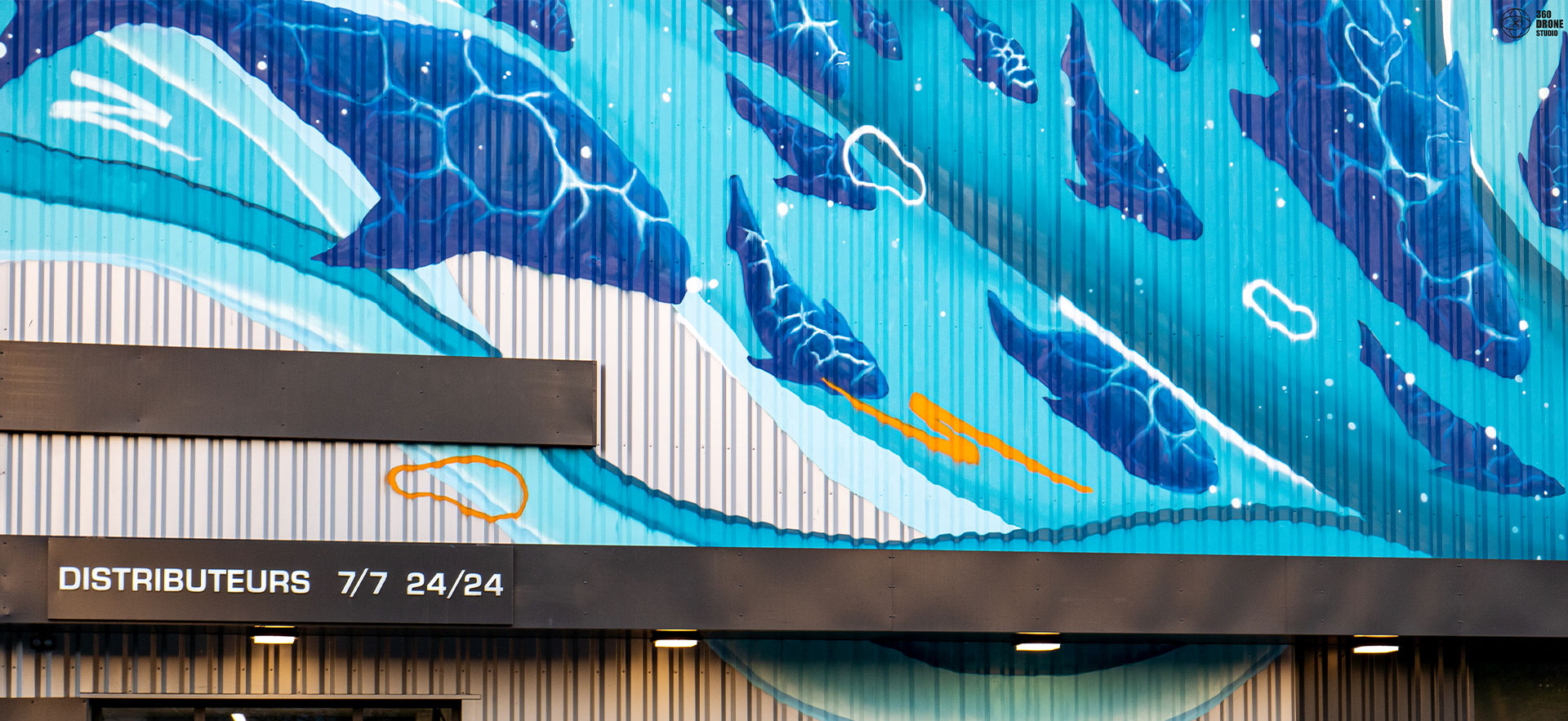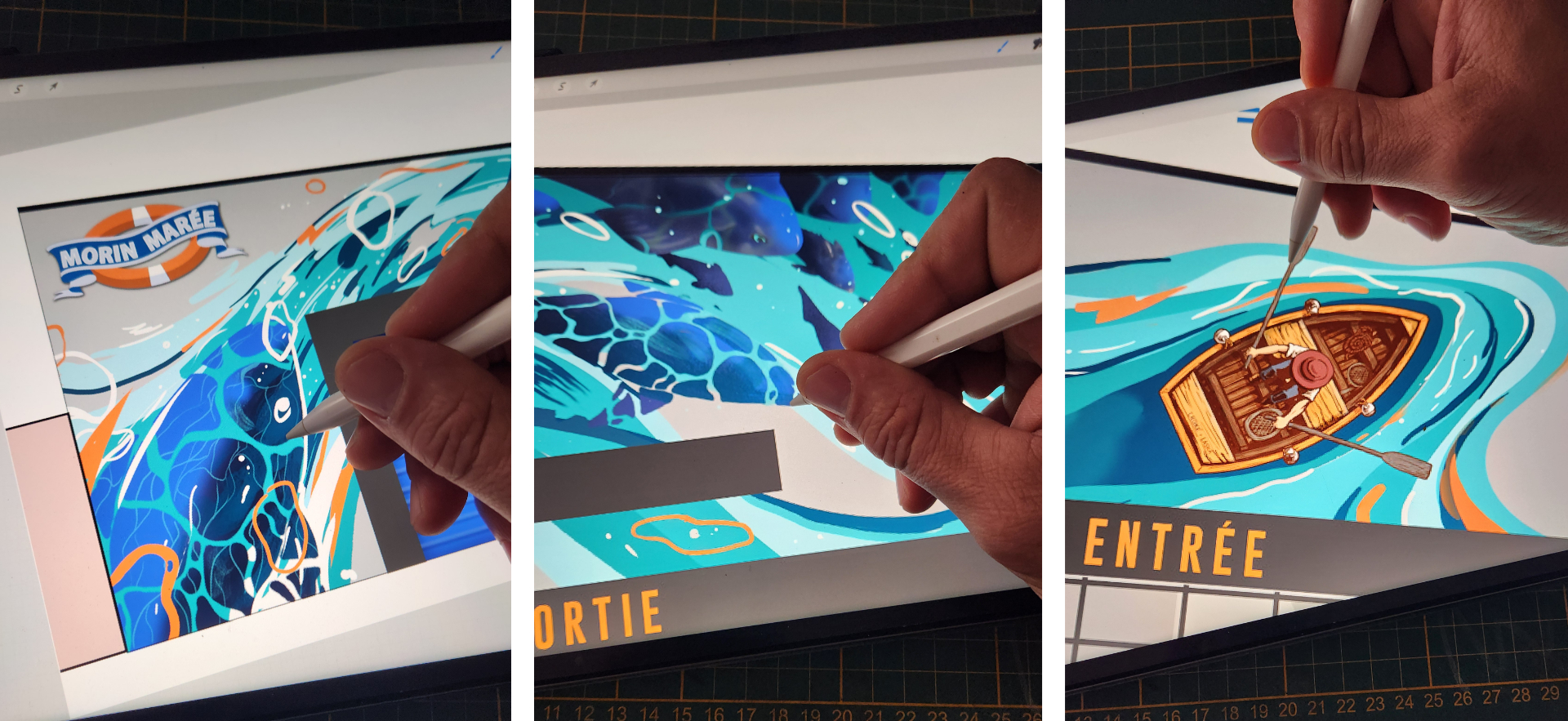Pour la création, j’ai choisi comme fil conducteur le mouvement gracieux d’une grande vague, qui démarre de façon énergique par un énorme poisson qui jaillit du sol et qui finit par une petite barque de pêcheur. Le tout aux couleurs du logo (le bleu des poissons et l’orange des effets dynamiques)