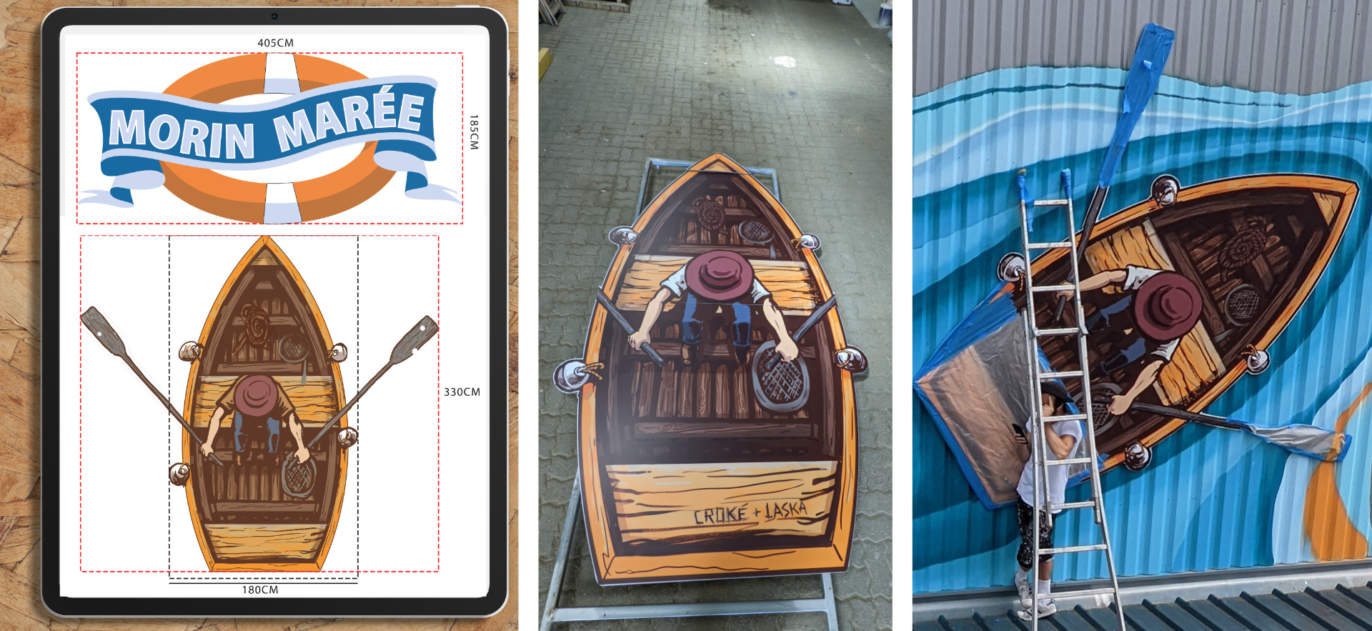 J’ai conçu la barque de pêcheur sur un logiciel vectoriel car, au vu de la nature du support (un bardage ondulé), nous avons préféré faire réaliser le logo et cette barque par une entreprise spécialisée : les Ateliers Vezes Publicité à Albi. Je leur ai donc fourni un fichier aux bonnes dimensions qu’ils sont venus installer eux-mêmes par dessus la fresque.