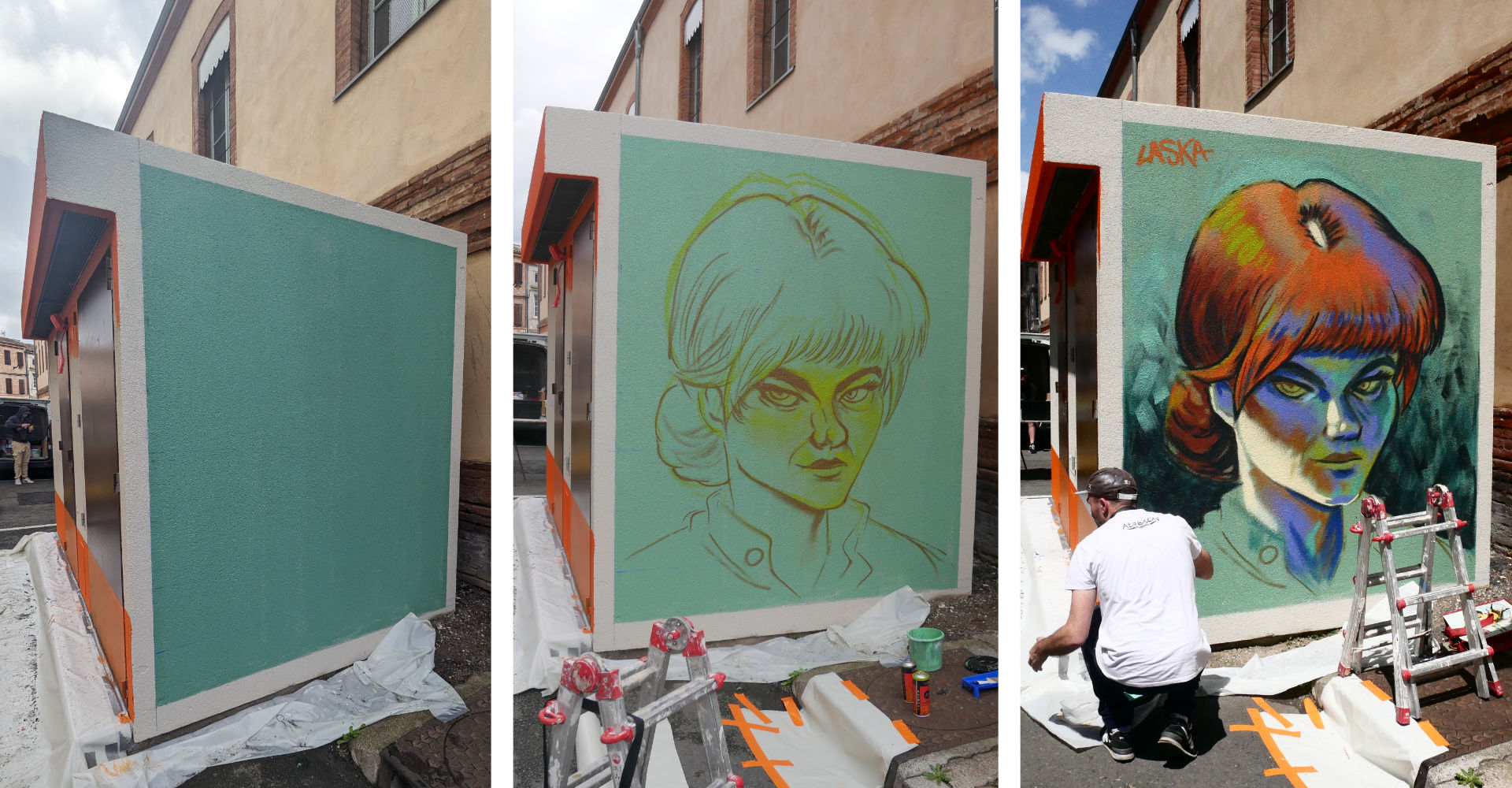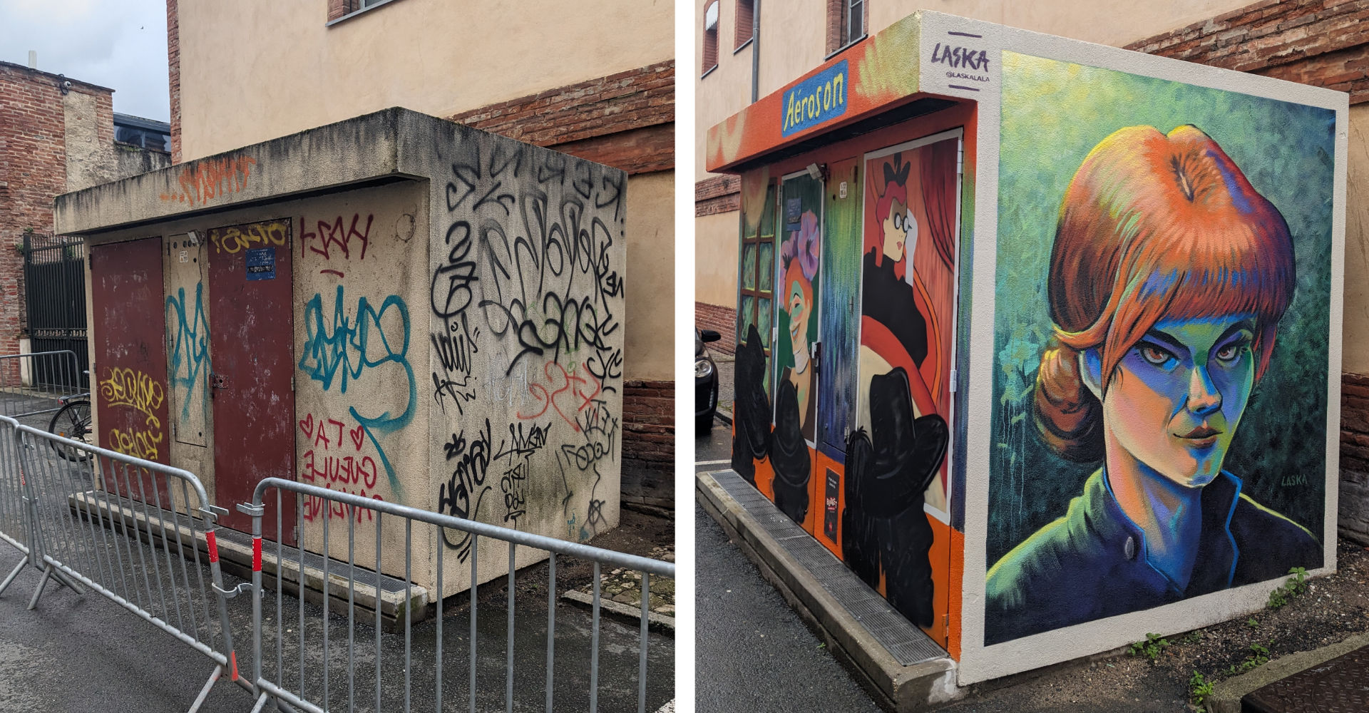 Cette fresque est la première du Budget Participatif initié par la Mairie d’Albi pour peindre des murs dans le centre-ville. Ce projet est également en partenariat avec Enedis vu qu’il s’agissait de repeindre un transformateur électrique. Situé en plein secteur classé Unesco et à quelque pas du Musée Toulouse-Lautrec, c’est donc tout naturellement que nous sommes partis sur un hommage au peintre Toulouse-Lautrec.
