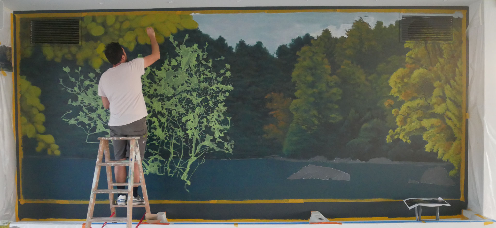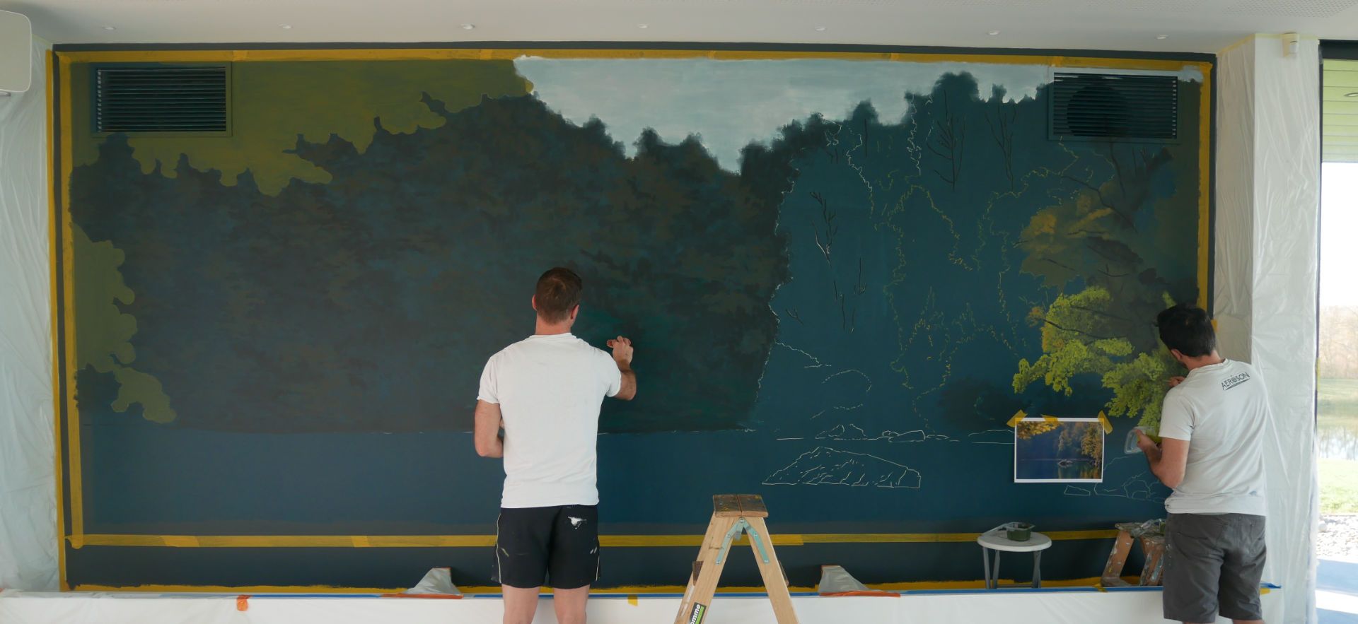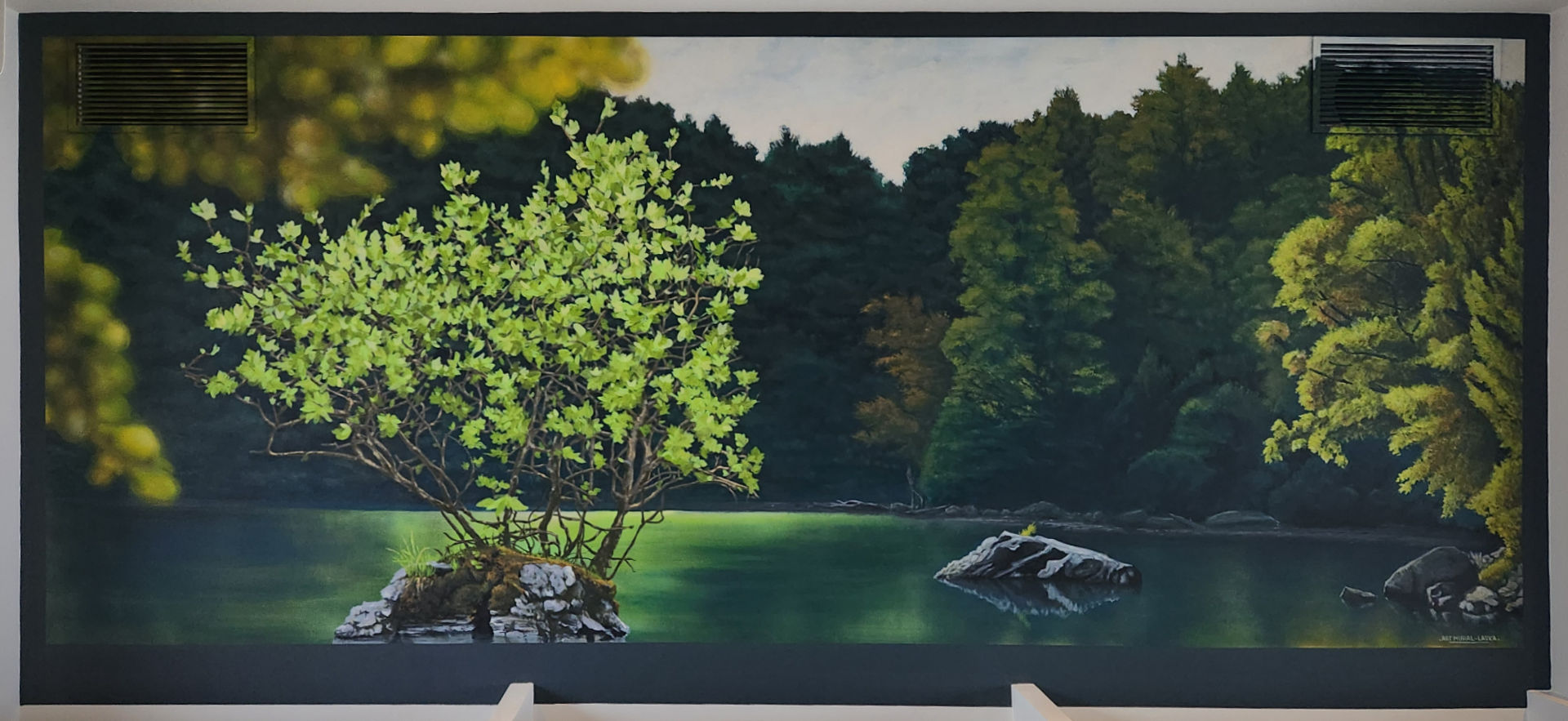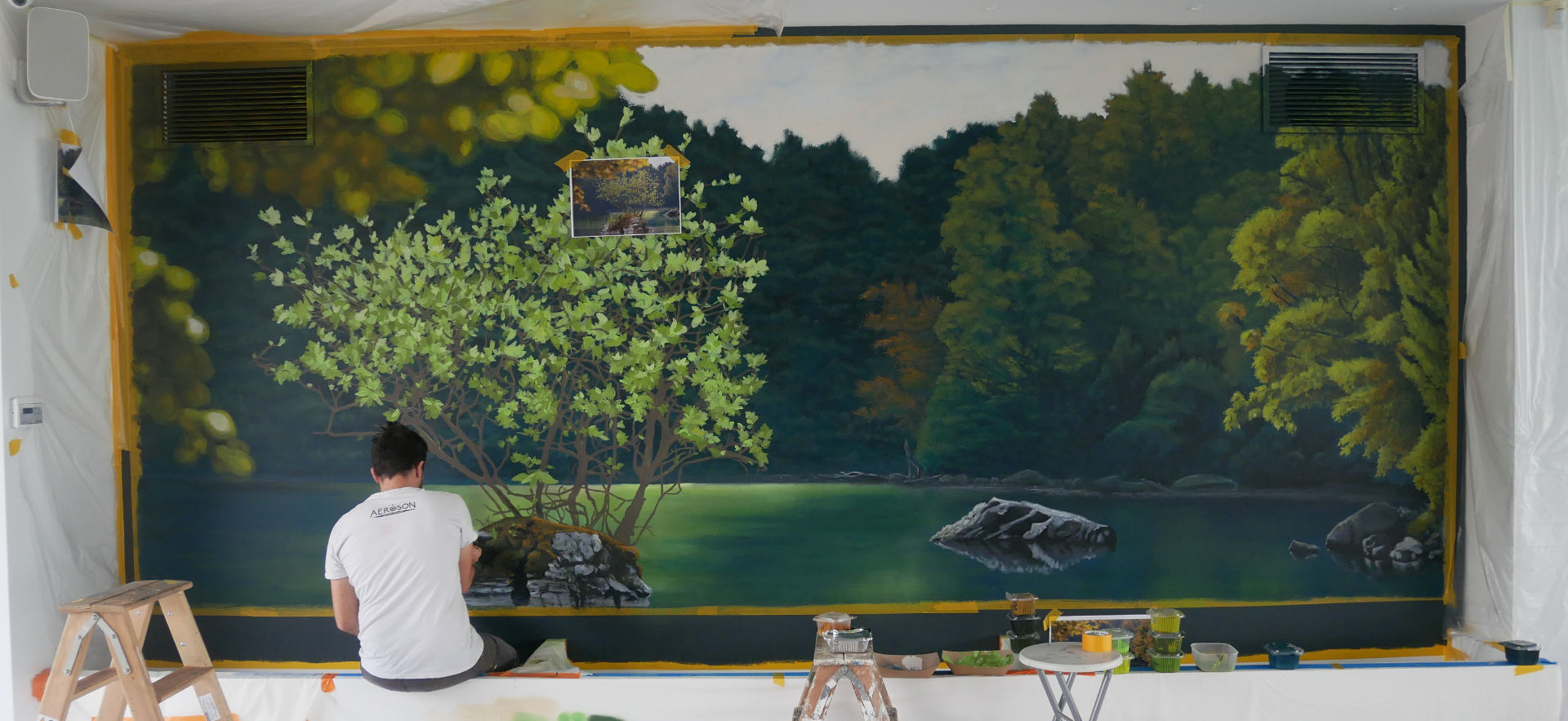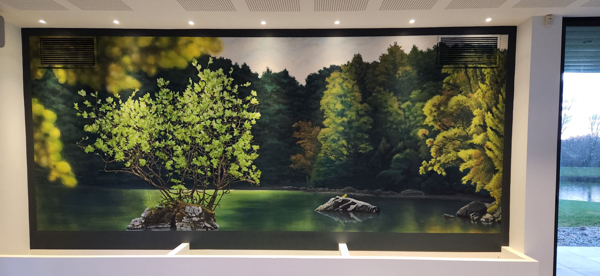 Fresque panoramique pensée comme une extension du paysage extérieur, qui prolonge le lac visible à travers les baies vitrées.