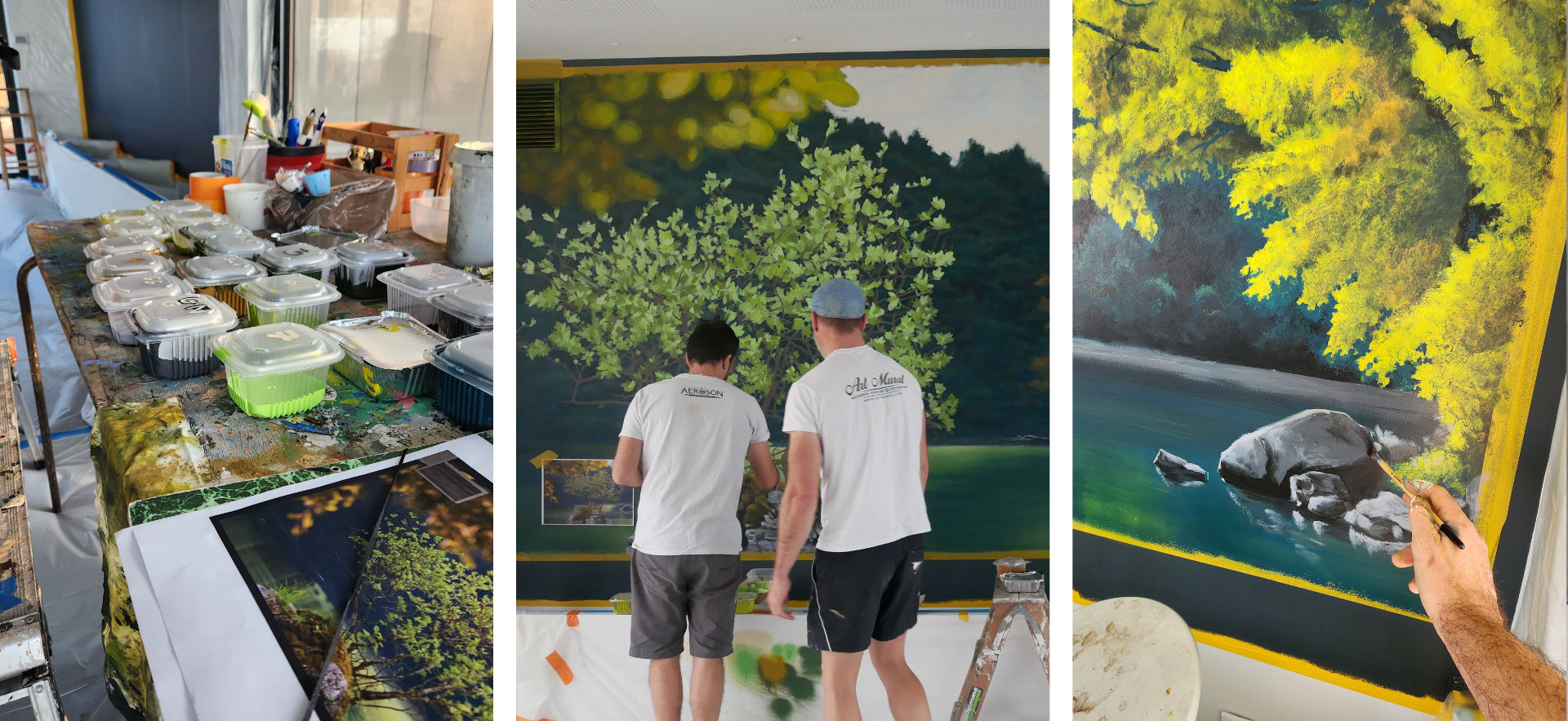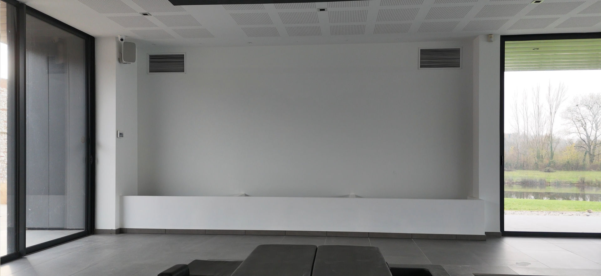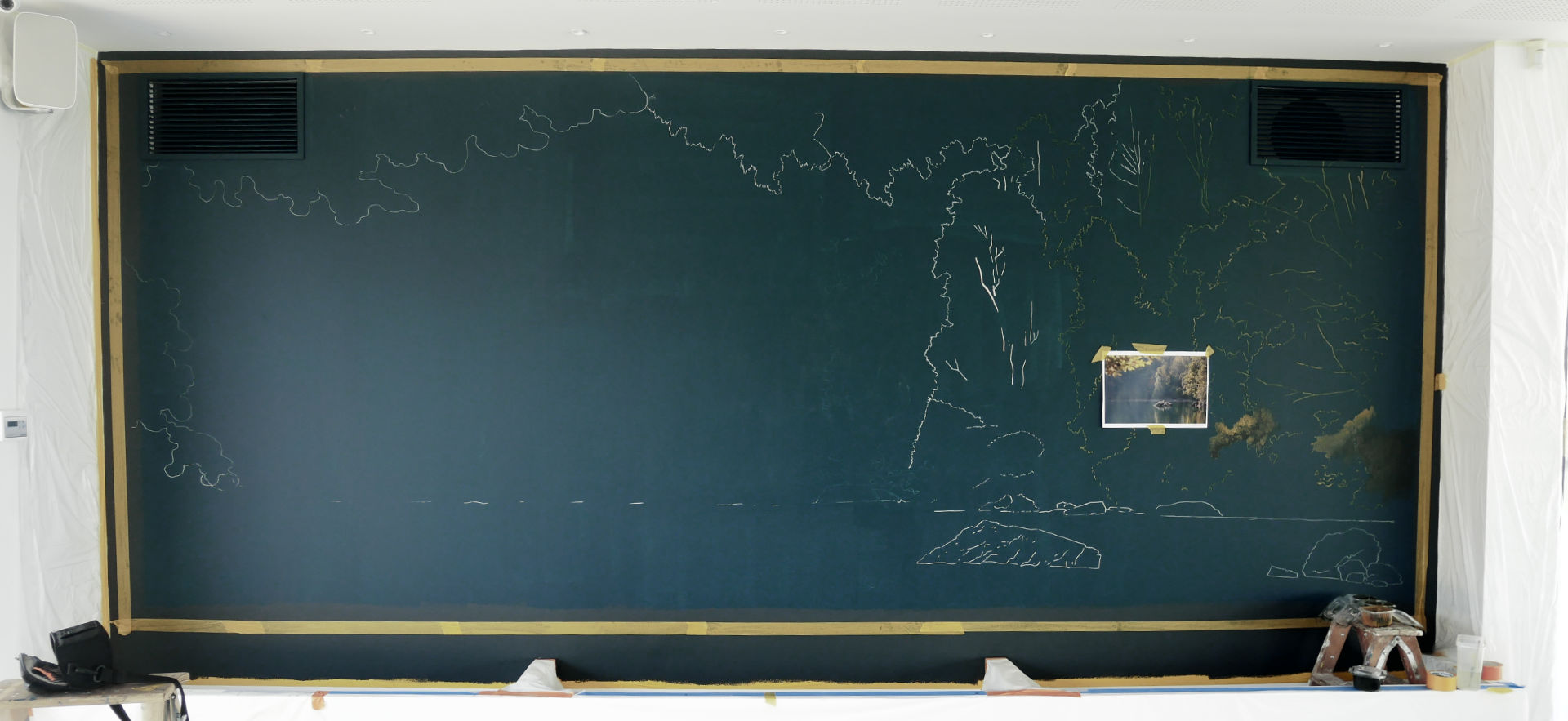Dans cette superbe maison contemporaine baignée de lumière, nous avons eu le privilège de réaliser un trompe-l’œil sur mesure, conçu pour prolonger visuellement le lac visible à travers les baies vitrées, tout en recréant une version apaisée et onirique. La composition joue sur les plans successifs : effet de flou d'objectif pour les feuilles d'arbres au premier plan, rochers flottants et forêt brumeuse en arrière-plan, afin accentuer la sensation de profondeur et offrir une échappée visuelle relaxante.