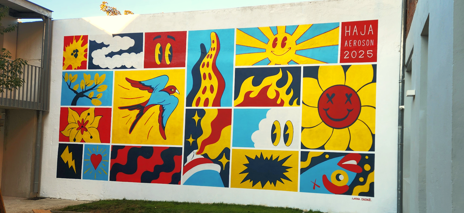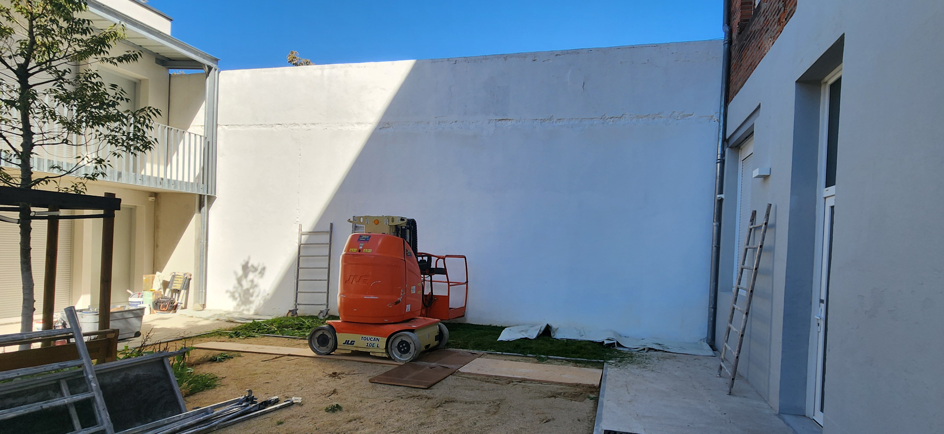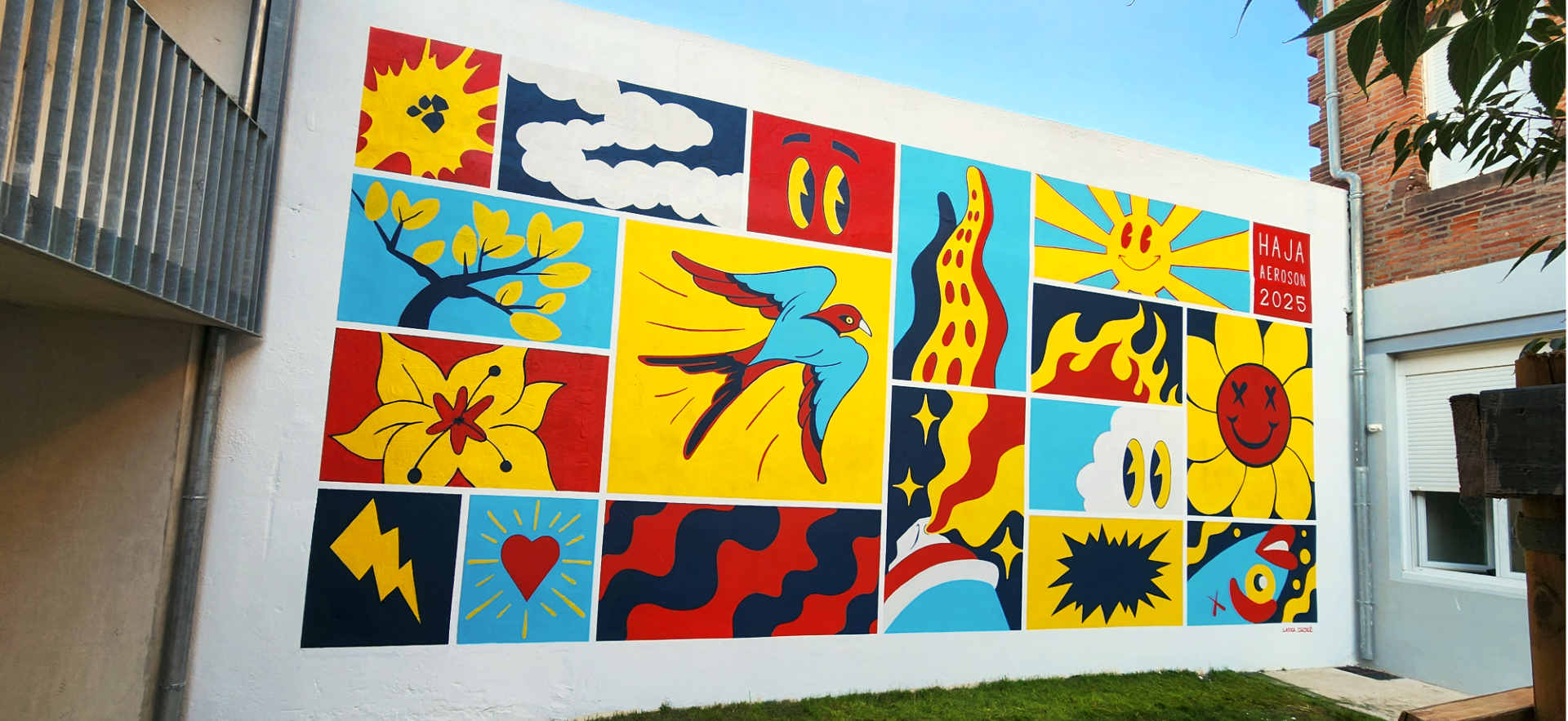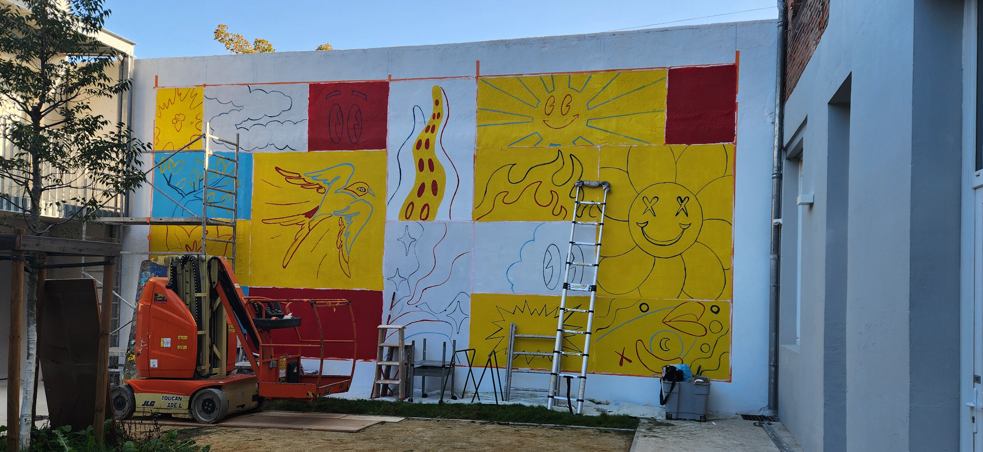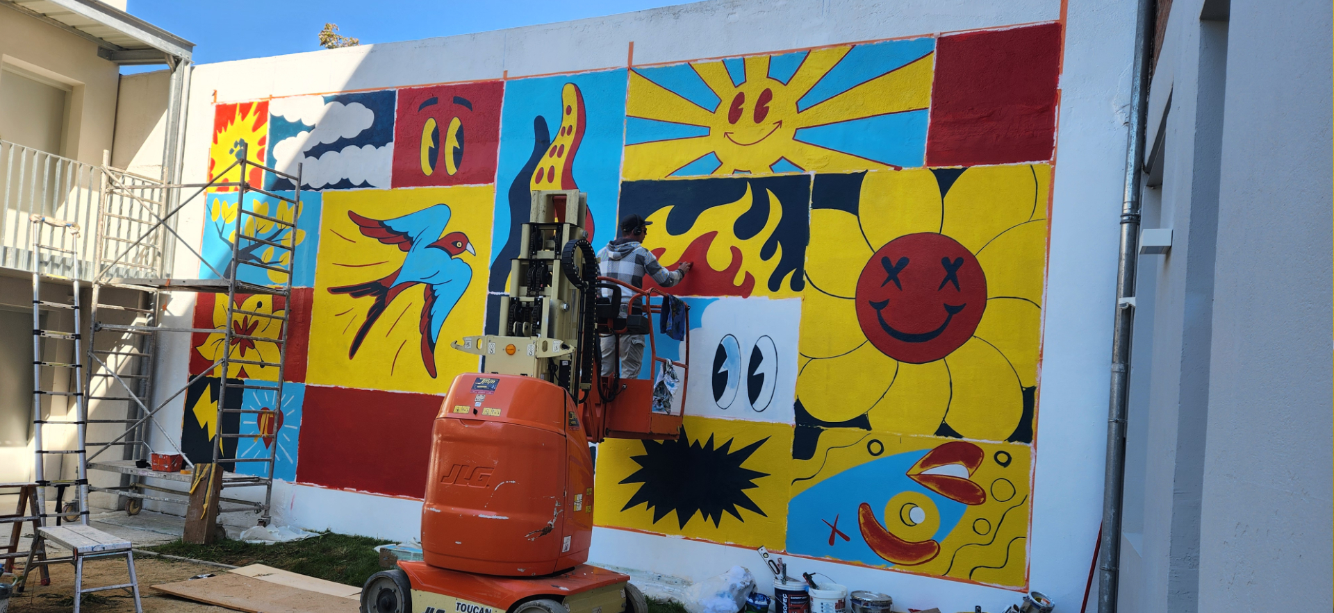 L’HAJA, association dédiée à faciliter l'accès au logement des jeunes de 16 à 30 ans à Albi, m’as contacté pour faire une grande fresque sur le mur du fond dans la cour du bâtiment historique complètement réhabilité afin d’offrir aux jeunes nouveaux résidents une ambiance accueillante et colorée.