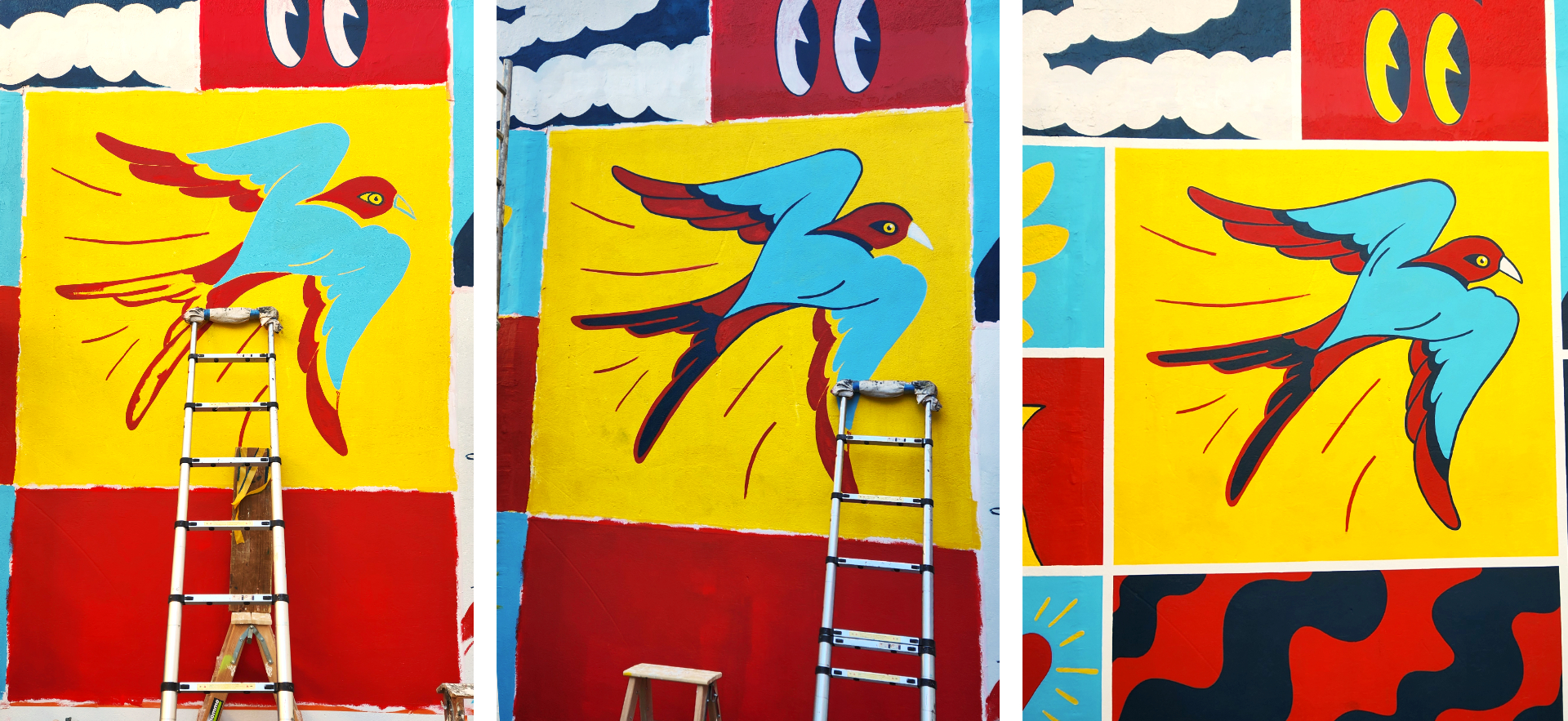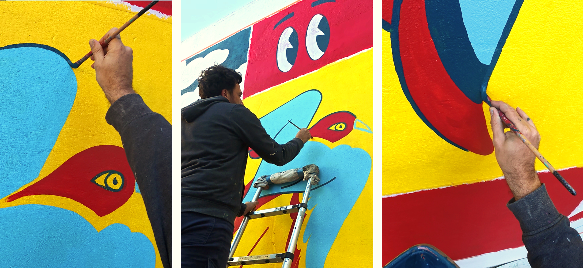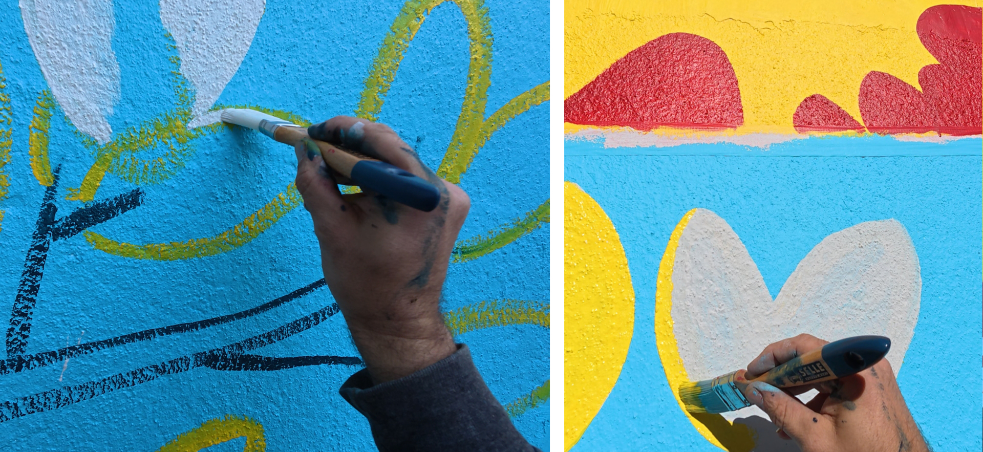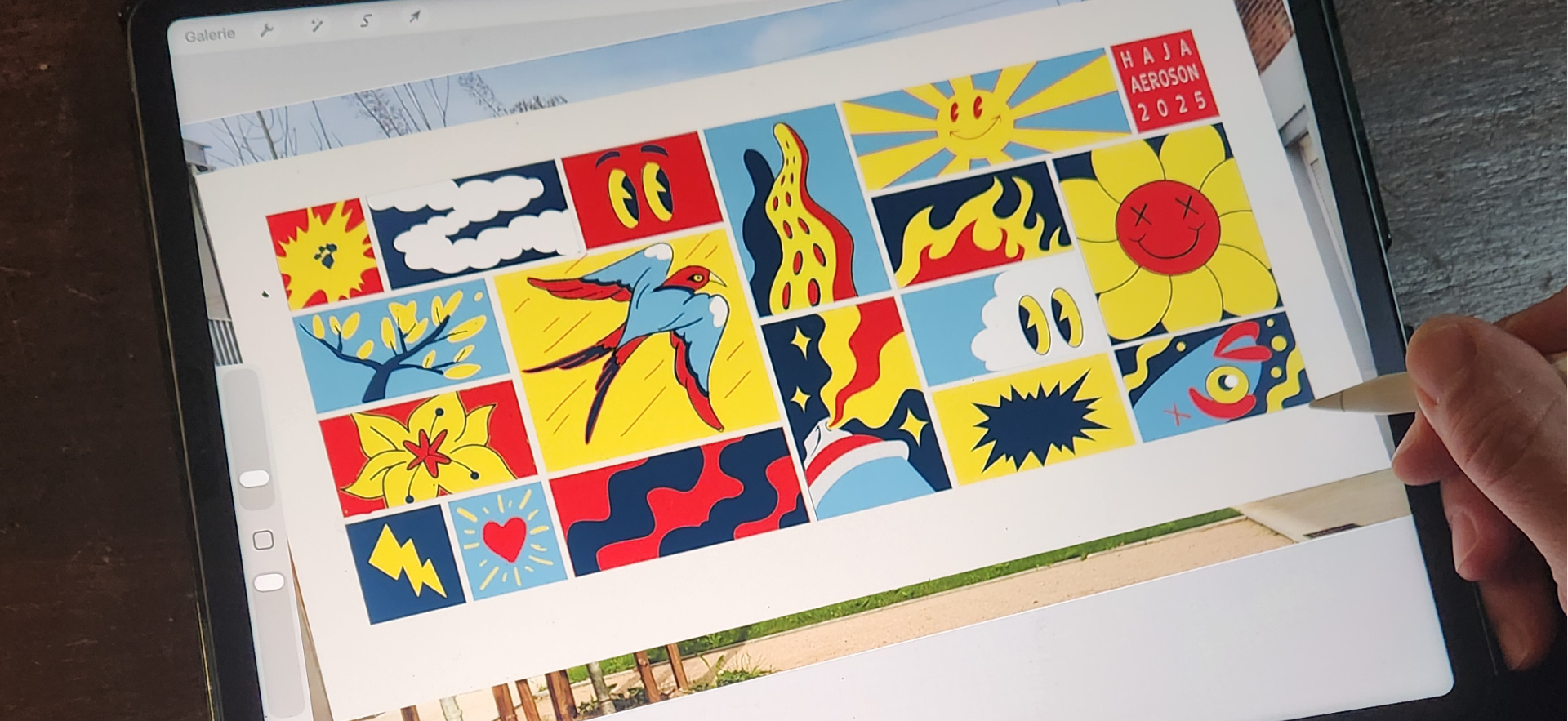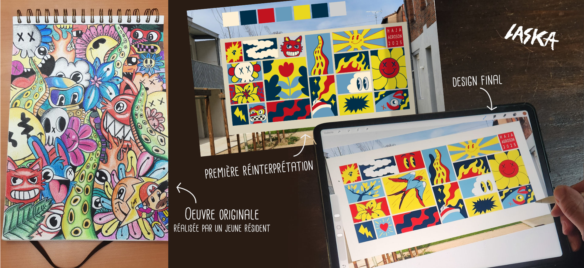 Pour réaliser la maquette, je me suis inspiré du dessin d’un jeune et talentueux résident de l’HAJA, que j’ai modernisé, synthétisé et restructuré pour donner une ambiance moderne, originale et joyeuse. J’ai donc conçu un visuel très graphique avec des formes simples et des couleurs savamment choisies car il fallait être efficace au vu de la taille du mur : 5,20m de haut par 10 de long !