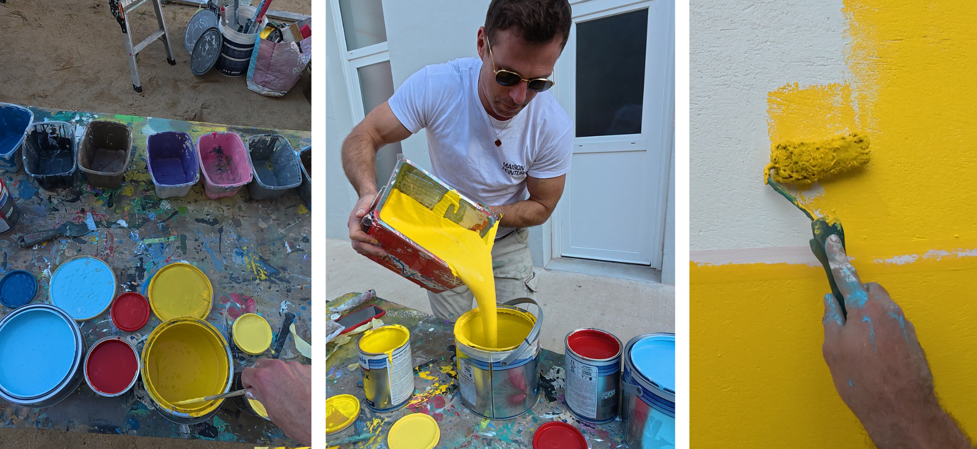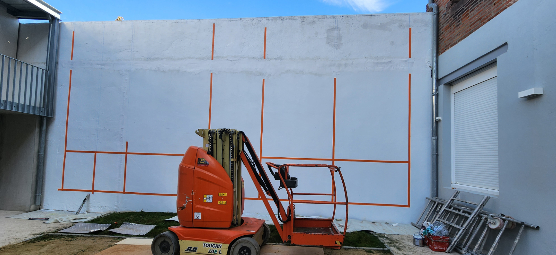 Avec Arnaud, nous avons pris du plaisir à peindre ces lignes pures en utilisant ces couleurs vibrantes tout en ayant pris soin au préalable de bien préparer le mur avec la reprise d’une tranchée visible par arnaud et en effectuant un quadrillage précis.